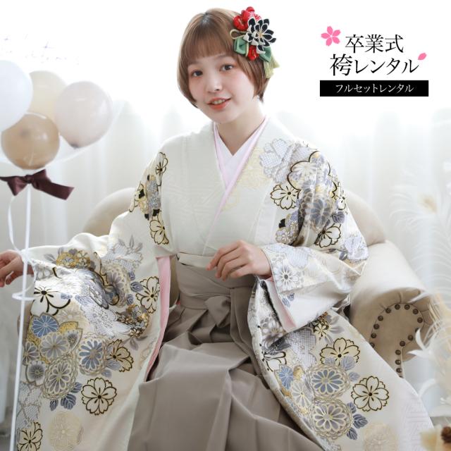 履物が選べるレンタル 卒業式 袴 レンタル 女 大学 フルセット 袴セット 女性 卒業式袴セット 袴フルセットレンタル シンプル 「生成り地に八重菊と絞り八重桜」 大人