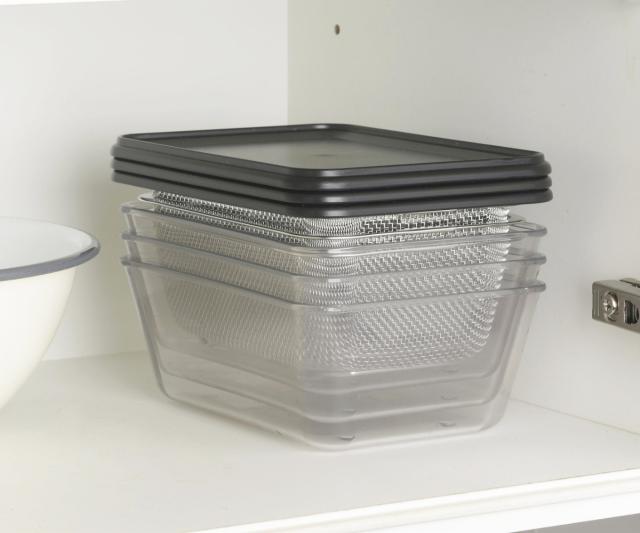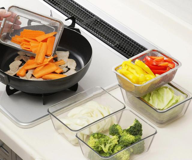 交互に積み重ねられる、ザルと耐熱バットとフタの各3個(9点)セットです。食材を小分けにすればスムーズに調理ができます。角型は丸型と比べて同じ量の食材もスッキリと収まり、積み重ねれば作業スペースが広々と使えます。