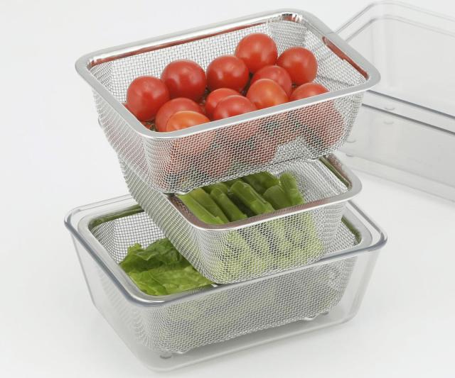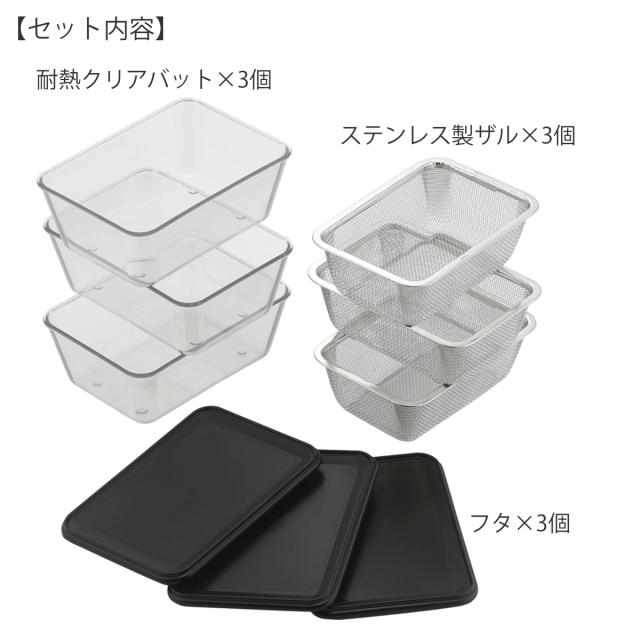 ●ステンレス製ザル×3個、耐熱クリアバット×3個、フタ×3個のセットです。