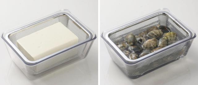●ステンレスザルとクリアバットはぴったり重なるので、貝の砂抜きや豆腐の水切りなどに大活躍です。
