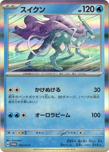 収録:スタートデッキGenerations スペシャルバトルセット コレクションナンバー:194/SV-P 種類:ポケモン タイプ:水 カード名:スイクン レアリティ:?