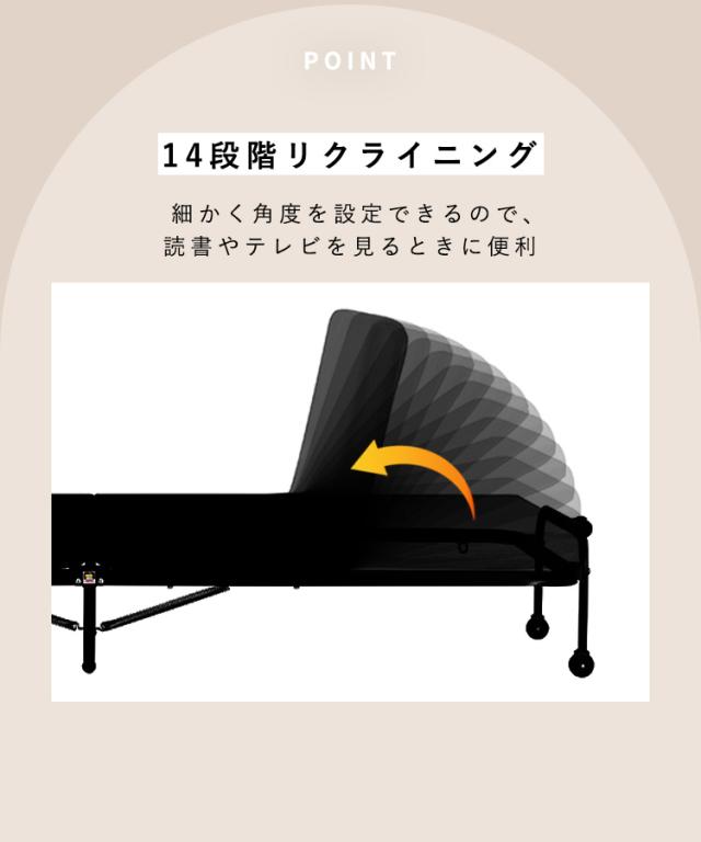 - 足を骨折し、布団生活では無理なので、購入しました。 枠がないので、使用していたマットレスをそのまま使えたのは良かったです。 在宅で仕事してるので、リクライニングにしたのも良かったです。 一日中ベッドの上なので、後は耐久性がどうかですね。