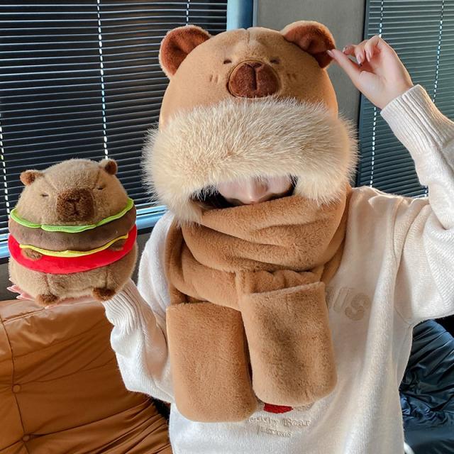 マフラー 帽子 フード 一体式 レディース メンズ ユニセックス 秋冬 防寒 防風 保温 ボア ふわふわ もこもこ フード付きマフラー ネックウォーマー カピバラ 手袋 ポケット 裾 プレゼント ギフト 冬 ハット ロリータ 可愛い あったか 防寒対策 冬物 動物