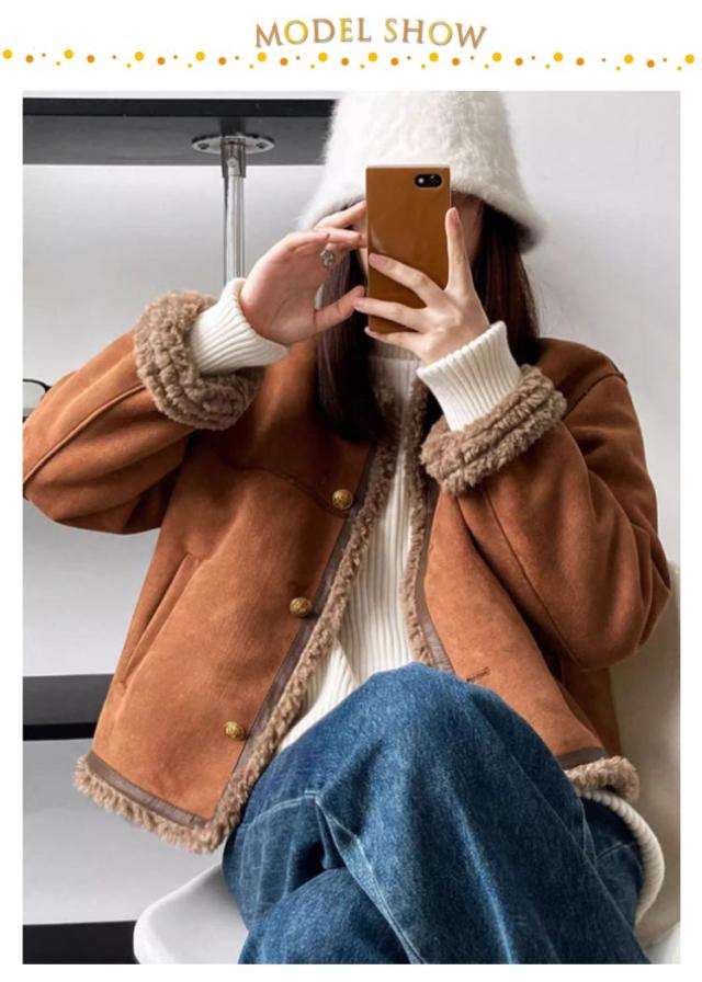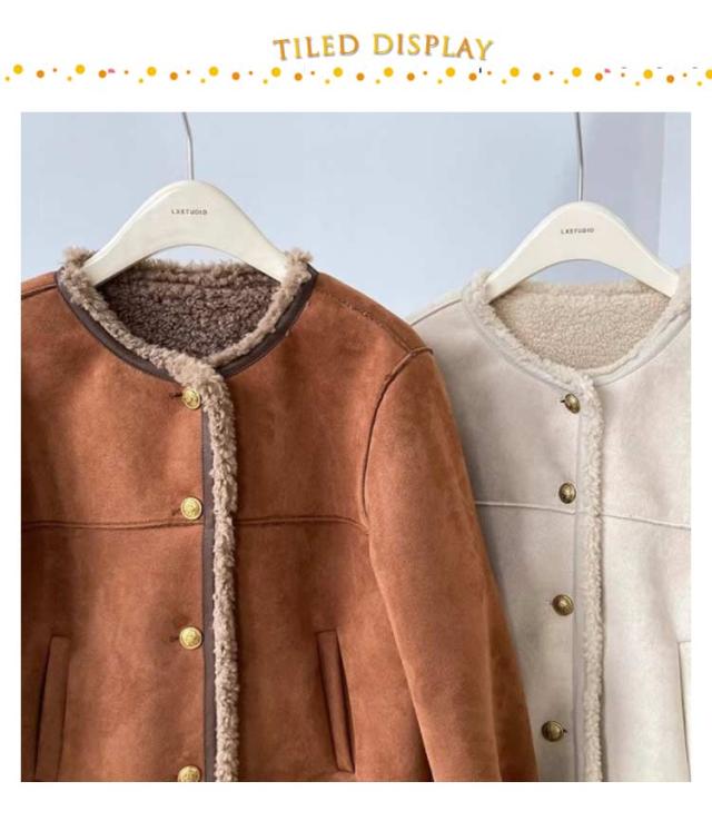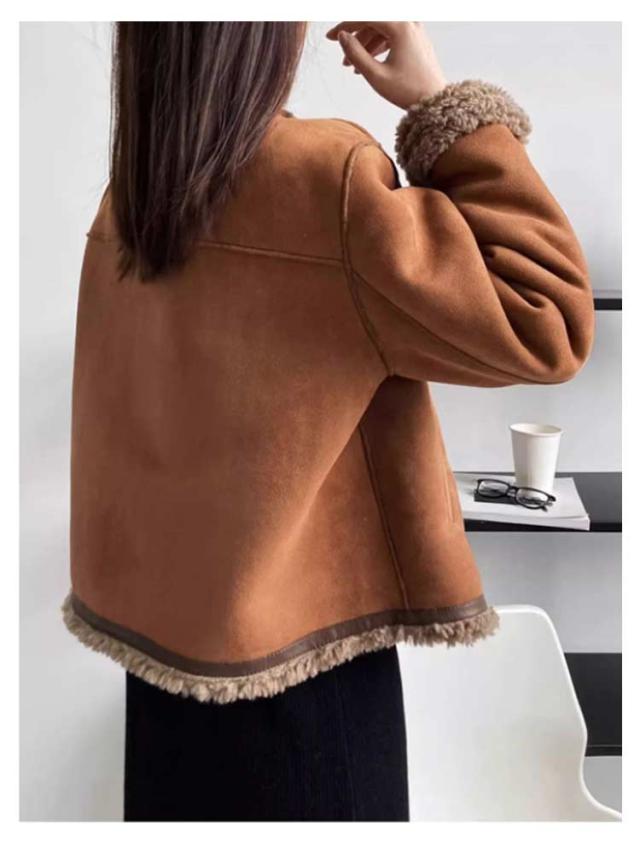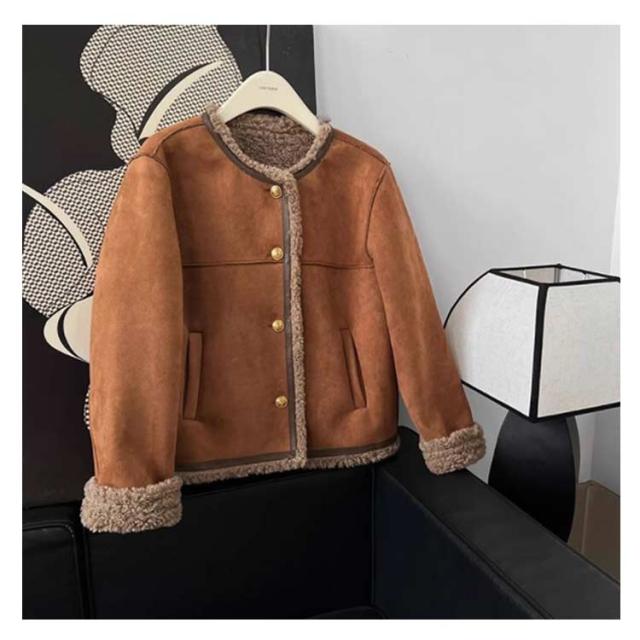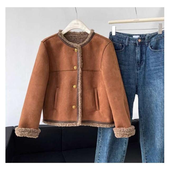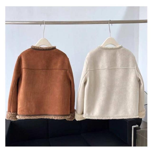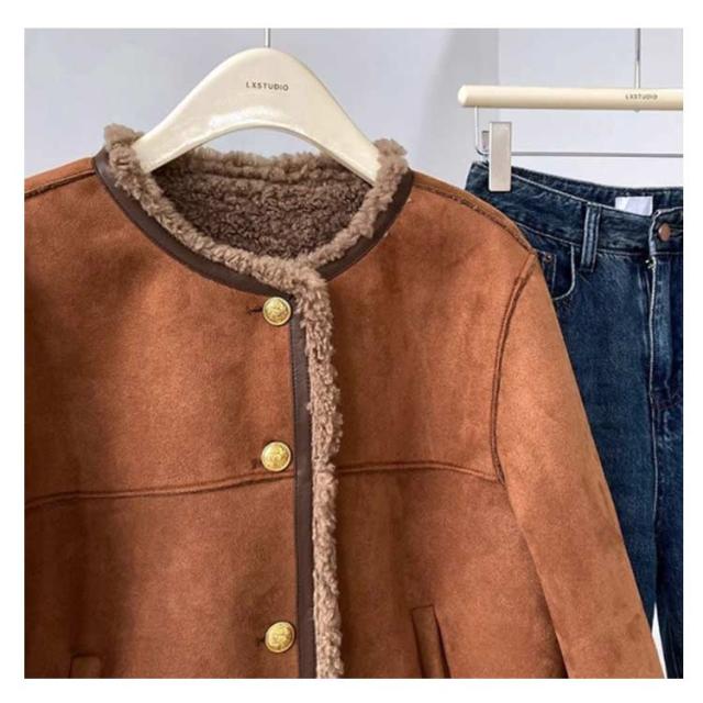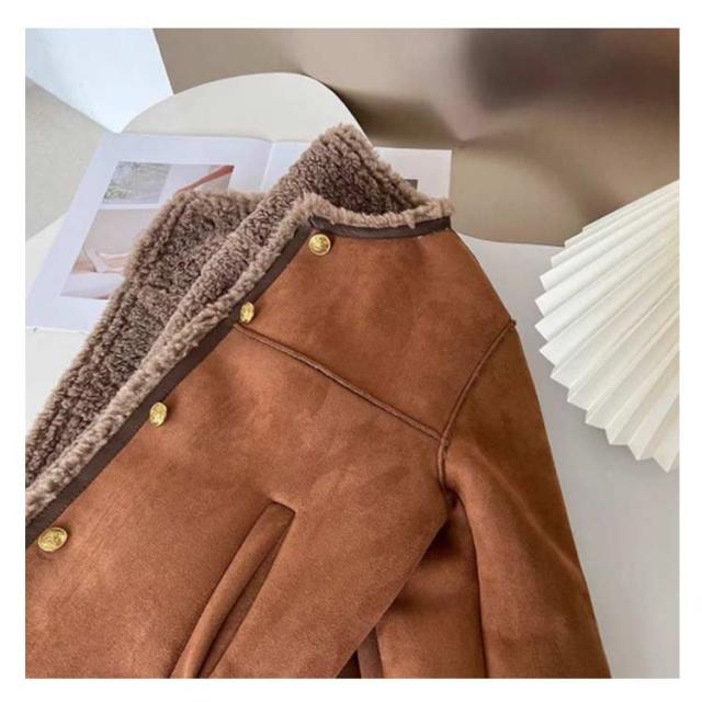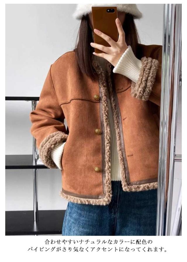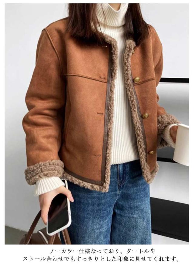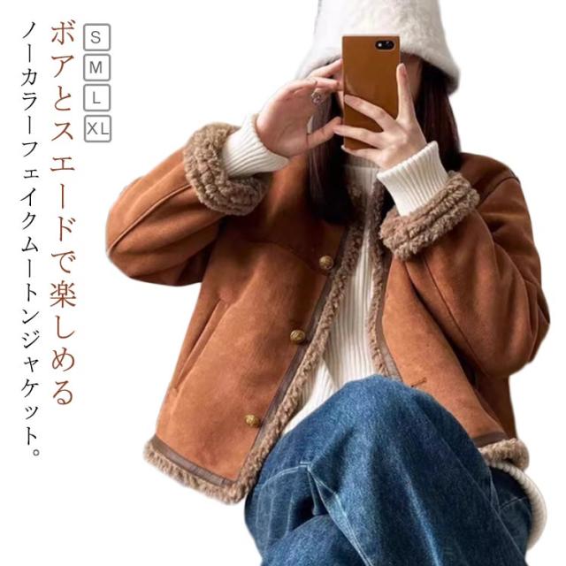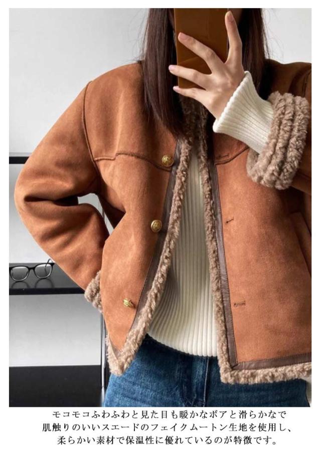 フェイクムートンジャケット ノーカラー レディース ジャケット フェイクムートン ボア 裏起毛 もこもこ 厚手 あったか フェイクムートンコート 秋 冬 ボアジャケット スエード スウェード アウター ゆったり 防寒 防風 韓国 おしゃれ スエードジャケット 【送無】