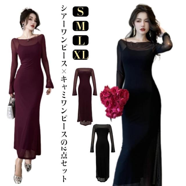 透け感 キャミワンピース ロング丈 タイトワンピース フェミニン ドレス タイト フェミニン キャミ シースルーワンピース シースルー ワンピース ロング シアーワンピース タイトワンピース セクシー きれいめ パーティー