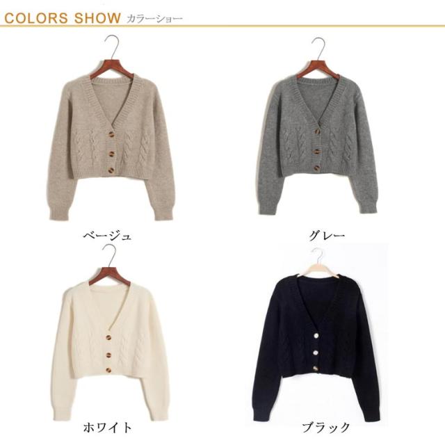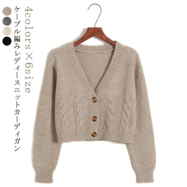 カーディガン レディース ざっくりニット ショート丈 可愛い Vネックカーディガン ボタン式 長袖 グレー 春物 春服 おしゃれ ブラック ベージュ ケーブル編み ホワイト ざっくりニット 黒 白