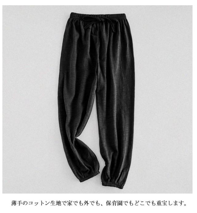 | 真夏でも涼しく履ける薄通気性の良い長ズボンです。 半ズボンと違い、紫外線や蚊や怪我からも保護されます。 薄手のコットン生地で家でも外でも、保育園でもどこでも重宝します。 パジャマとしてもバッチリです。 ウエストと裾はゴムが入っており、ジャージ、ジョガーパンツスタイルです。 | |