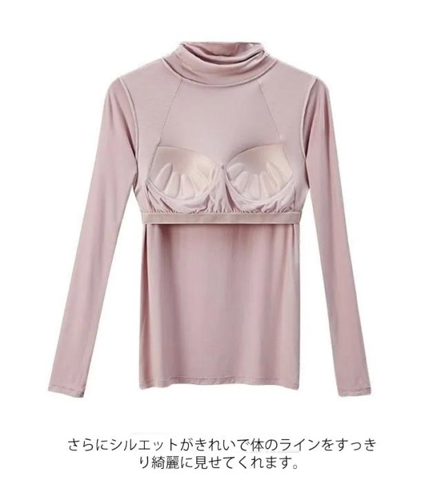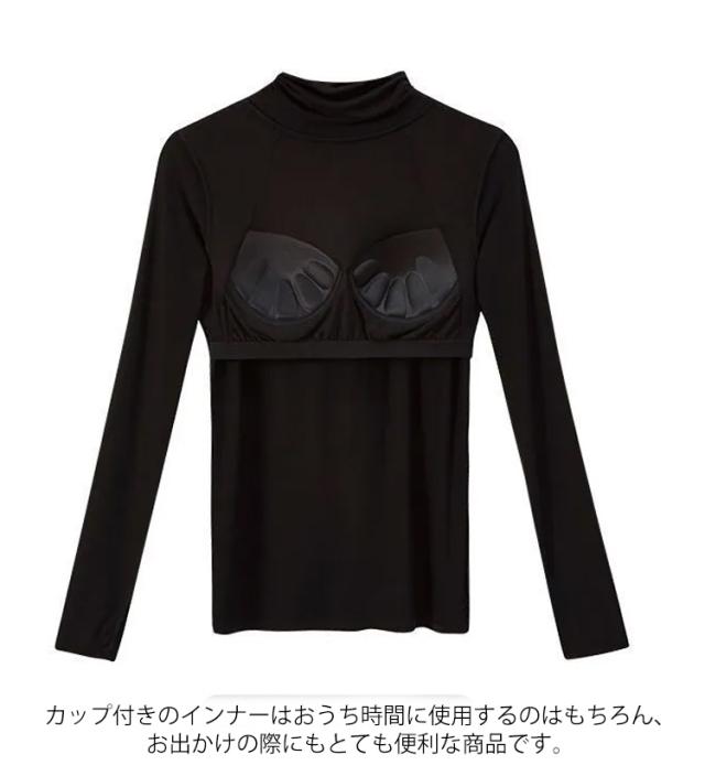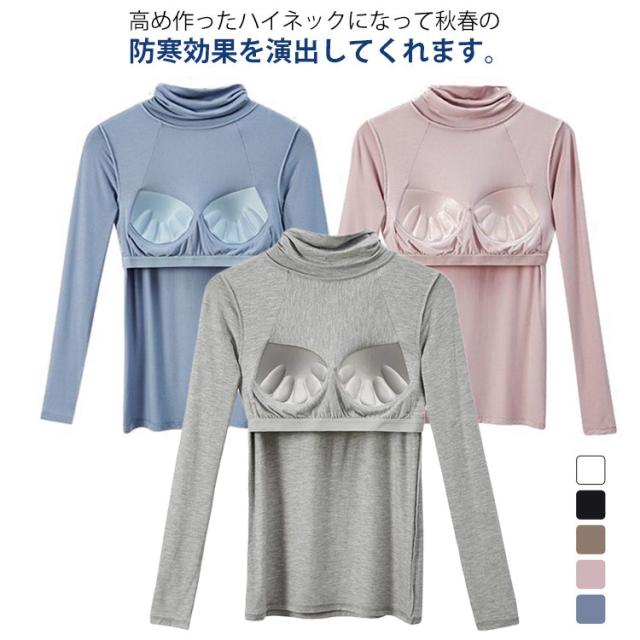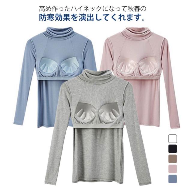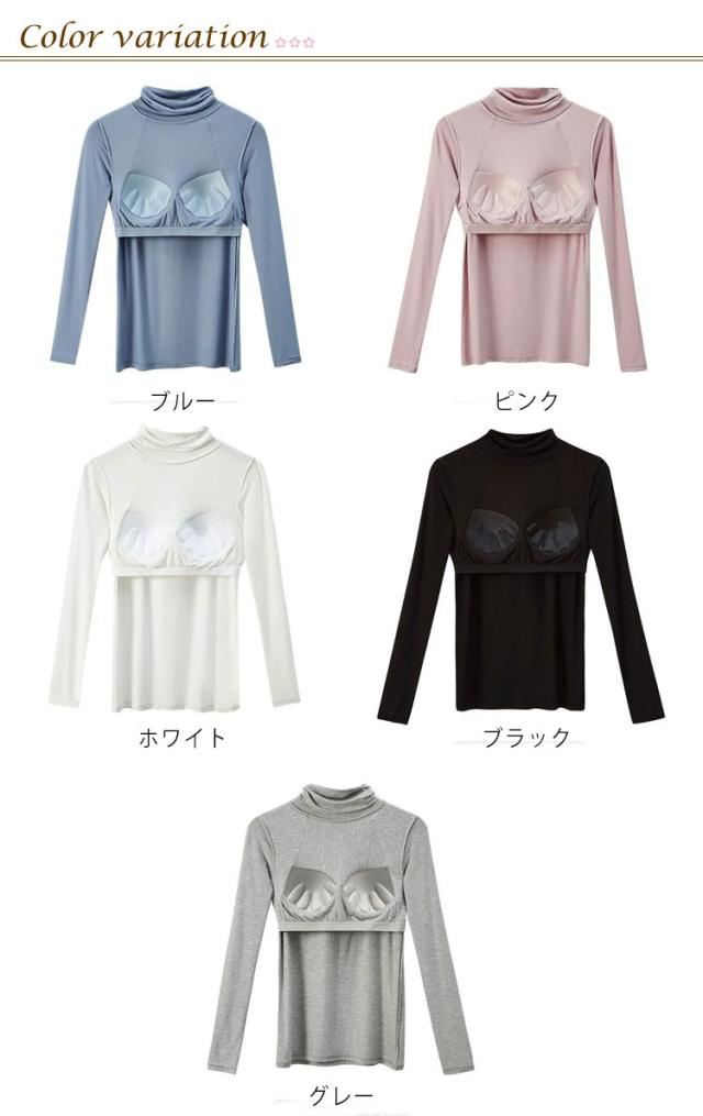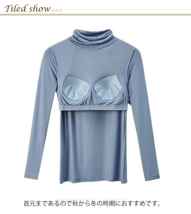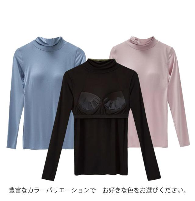 Tシャツ インナー ストレッチ 速乾 レディース トップス 長袖インナー 長袖Tシャツ ルームウエア ブラトップ 下着 無地 タートルネック 伸縮性 通気性 締め付けない カップ付きカットソー カップ付きカットソー 部屋着 ブルー 肌着 ホワイト ブラック