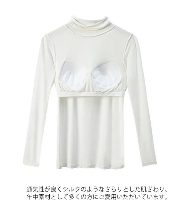 | 首元まであるので秋から冬の時期におすすめです。 高め作ったハイネックになって秋春の防寒効果を演出してくれます。 さらにシルエットがきれいで体のラインをすっきり綺麗に見せてくれます。 通気性が良くシルクのようなさらりとした肌ざわり、年中素材として多くの方にご愛用いただいています。 カップ付きのインナーはおうち時間に使用するのはもちろん、お出かけの際にもとても便利な商品です。 シャツやコートなどを羽織ったレイヤードスタイルもおすすめです。 豊富なカラーバリエーションで お好きな色をお選びください。 | |