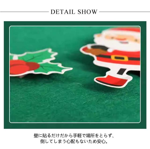 | 年に一度のクリスマスを盛り上げるクリスマスツリー! 鮮やかな色、フェルト生地で暖かく雰囲気に! 壁に貼るだけだから手軽で場所をとらず、倒してしまう心配もないため安心。 簡単に掛けることができ、子どもも遊びながら飾り付けが出来ます。 ショッピングやスーパー、ホテル、家庭、幼稚園などの装飾または他の装飾として使用! 通常のクリスマスツリーに比べると、軽量で持ち運びも楽々です。小さく畳んで収納できるので、収納場所にも困りません。 電池式LEDライトも付属。届いてすぐに、クリスマス気分を楽しめます。 | |