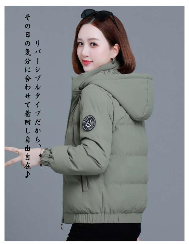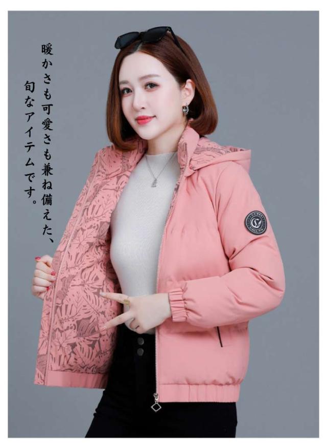 秋 あったか 軽量 アウター 中綿 ジャケット レディース リバーシブル 冬 無地 花柄 ショート丈 コンパクト 厚手 通学 ブルゾン 防寒 保温 エコダウンジャケット スリム 細身 取り外し可能フード付き カジュアル おしゃれ 中綿ジャケット 通勤