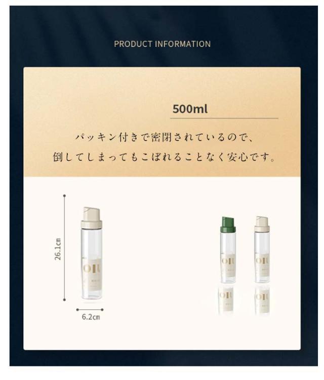 | 食用油などのつめかえに便利なオイルボトル2個セット 傾けるだけで自動で蓋が開く。 調味料の液漏れを防止するためにシリコンシールでしっかりと密閉します。 醤油、みりん、酒、酢、油などの調味料を入れ替えてすっきり整理整頓できるボトルです。 パッキン付きで密閉されているので、倒してしまってもこぼれることなく安心です。 | |