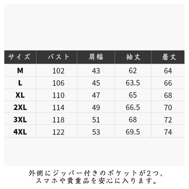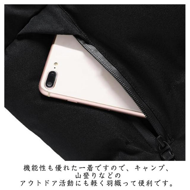 | ふわふわボリューム感のある中綿をたっぷりと詰まっており、暖かい! 真冬でも十分な防寒保温効果を確保している一方、ストレスを感じない軽量さも実現。 優れた防風性と防寒性で、冬に信頼できる一着です。 フード付き(取り外し不可)、首元はハイネックのように閉めることができます、風の侵入をしっかり防止。 外側にジッパー付きのポケットが2つ、スマホや貴重品を安心に入ります。 通勤道でスーツの外に羽織ってもオッケー、私服としてジーンズ/チノパンと合わせのカジュアルスタイルも素敵! 機能性も優れた一着ですので、キャンプ、山登りなどのアウトドア活動にも軽く羽織って便利です。 | |