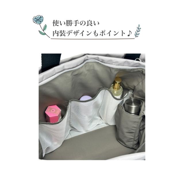 ポケット:【外側】ファスナーポケット×1、メッシュオープンポケット×4、オープンポケット×3【内側】メッシュオープンポケット×3、ファスナーポケット×1、ボトルホルダー×1【付属品】チャーム×1 カラー:ブラック、ネイビー、カーキブラウン、ライトグレー