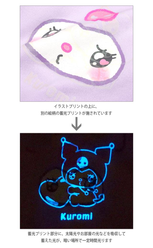 サンリオキャラクター「マイメロディクロミ」の裏起毛パジャマ上下セット。蓄光プリント部分に、太陽光やお部屋の光などを吸収して蓄えた光が、暗い場所で一定時間光ります。お着替えを嫌がったりまだ寝たくないお子様、電気を消すのや一人で寝るのが苦手なお子様のおやすみを応援するパジャマです。