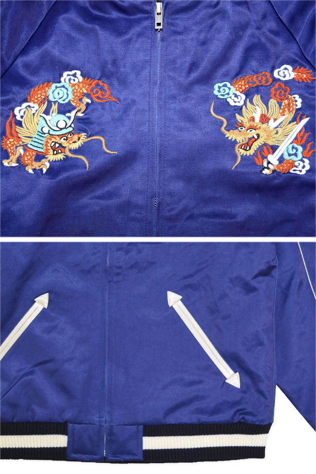 龍・富士山・鳥居などスカジャンらしいモチーフですが、龍に兜や刀・軍配を持たせたサムライらしいデザインになっています。