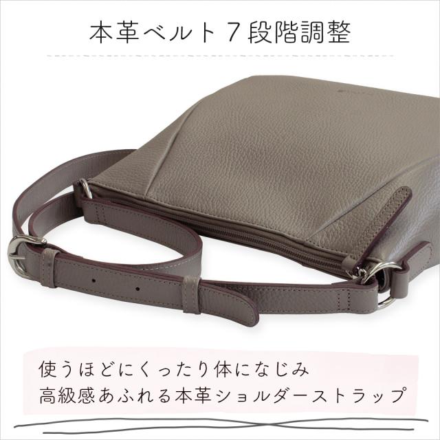 本革仕様のショルダーストラップは7段階調整、肩掛けにも斜め掛けとコーディネートに合わせた持ち方を楽しめます。
