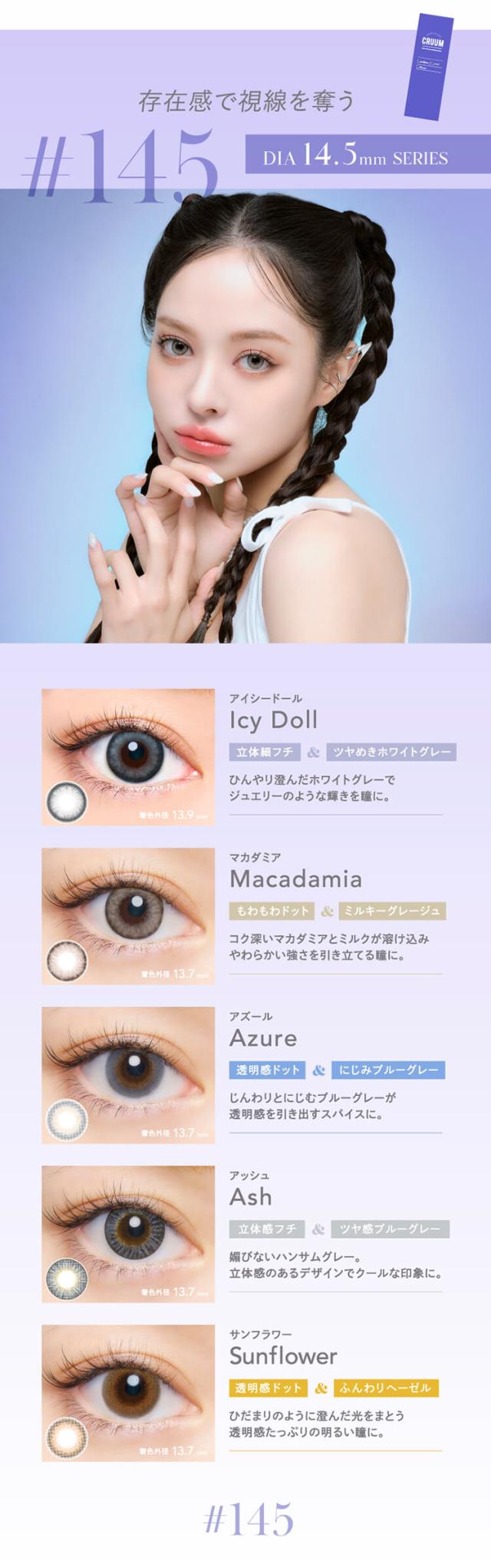 ■ペアーミルク(PEAR MILK) 【DIA14.1mm / GDIA13.0mm】 「なじみドット&ミルキーグリーン」とろっとミルクと柔らかなグリーンで、まろやかなのにみずみずしさのある瞳に。 ■マカダミア(MACADAMIA) 【DIA14.5mm / GDIA13.7mm】 「もわもわドット&ミルキーグレージュ」コク深いマカダミアとミルクが溶け込み、やわらかい強さを引き立てる瞳に。 ■イブニング(EVENING) 【DIA14.1mm / GDIA13.2mm】 「くっきり細フチ×三日月型ベージュ」ゆらめく月をこっそり忍ばせ、こころ高鳴るいつでも輝く瞳に。 ■サンフラワー(SUN FLOWER) 【DIA14.5mm / GDIA13.7mm】 「透明感ドット×ふんわりヘーゼル」ひだまりのように澄んだ光をまとう透明感たっぷりの明るい瞳に。 ■スモークグレー(SMOKE GRAY) 【DIA14.1mm / GDIA13.0mm】 「なじみドット×透け感グレー」ほどよくラフな透け感。背伸びしないグレーでヌケのある瞳に。 ■ピンクホリック(PINK HOLIC) 【DIA14.1mm / GDIA13.0mm】 「なじみドット×サクラピンク」ニュアンスピンクという新提案。絶妙なヌケ感と透明感を仕込んで。 ■アクア(AQUA) 【DIA14.1mm / GDIA13.2mm】 「細フチ×透け感グレー」ウォータリーなツヤ発色。ときめくようなきらっとした瞳に。 ■アズール(AZURE) 【DIA14.5mm / GDIA13.7mm】 「透明感ドット×ブルーグレー」じんわりとにじむブルーグレーが透明感を引き出すスパイスに。 ■アッシュ(ASH) 【DIA14.5mm / GDIA13.7mm】 「立体感フチ×ブルーグレー」媚びないハンサムグレー。立体感のあるデザインでクールな印象に。 ■ベイビーキャット(Baby Cat) 【DIA14.1mm / GDIA13.4mm】 「ぼかし太フチ×甘めブラウンベージュ」子猫のようにいたずらな甘めブラウンで愛嬌を味方につけた瞳に。 ■アイシードール(Icy Doll) 【DIA14.5mm / GDIA13.9mm】 「立体細フチ×ツヤめきホワイトグレー」ひんやり澄んだホワイトグレーでジュエリーのような輝きを瞳に。 |