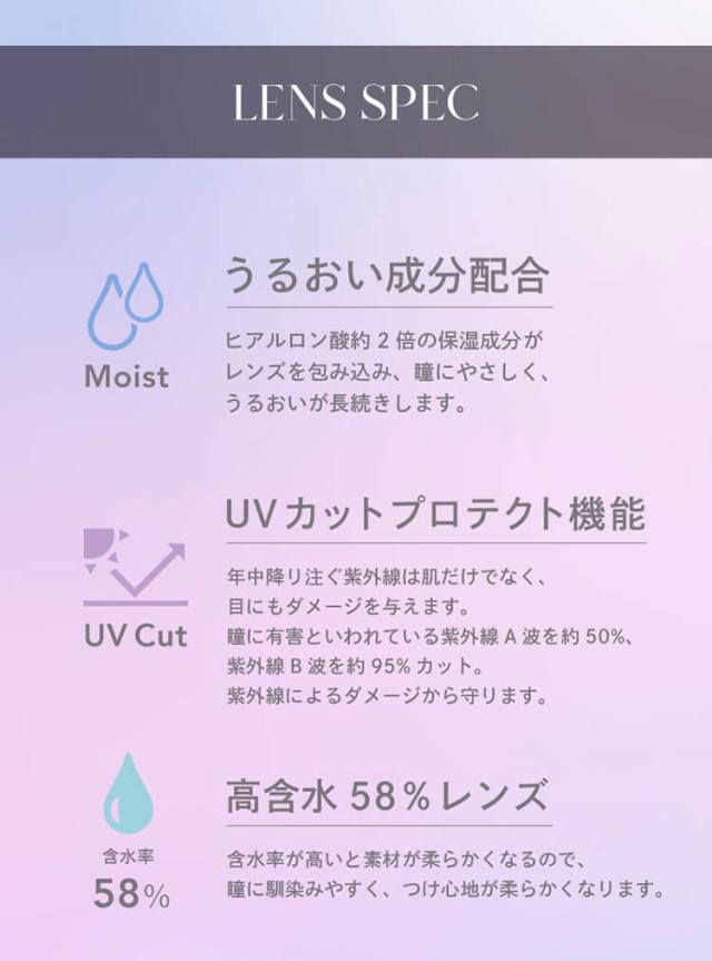 | ●商品ポイント | 14.1mm or 14.5mmから選べるバリエーション豊富なワンデーカラコン。 こだわりがぎゅっと詰まったカラバリでその日の気分によってレンズを変えて気分転換♪ 気になる紫外線もUVカット機能付きで安心! |