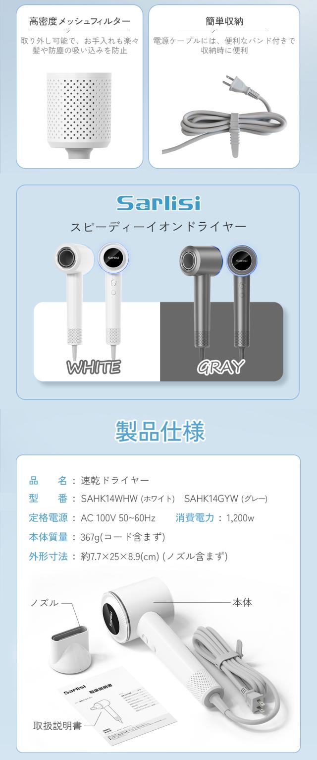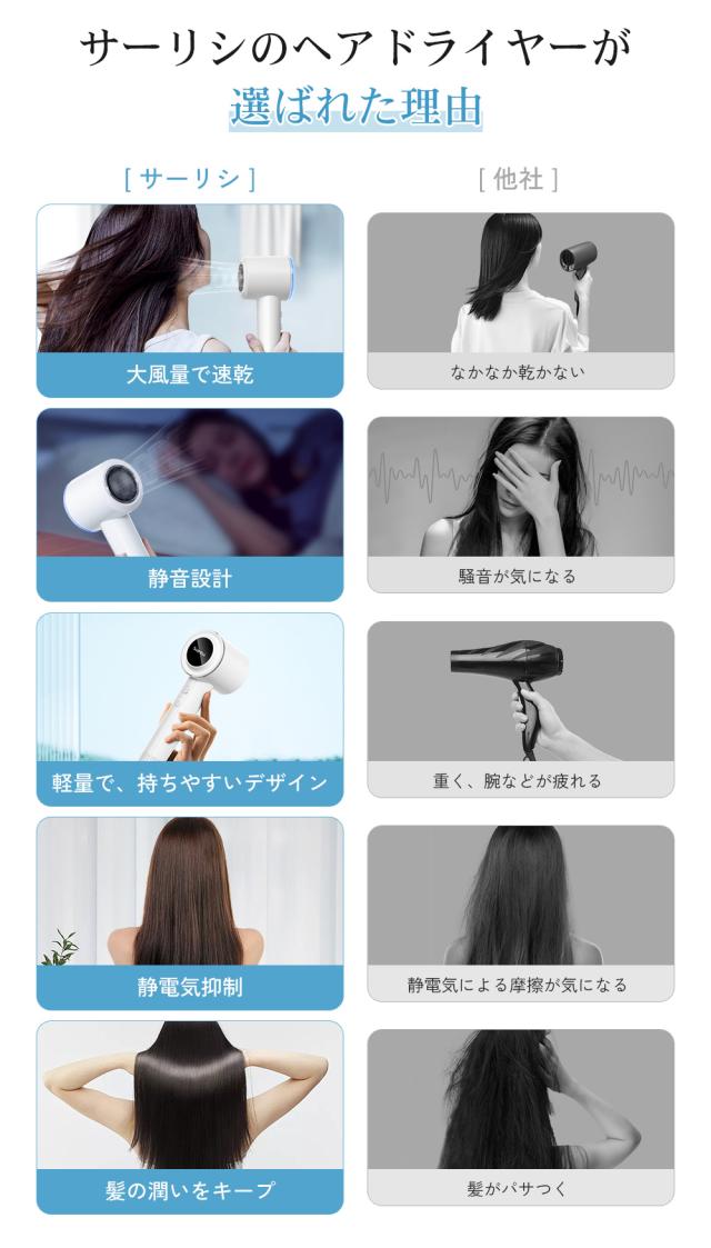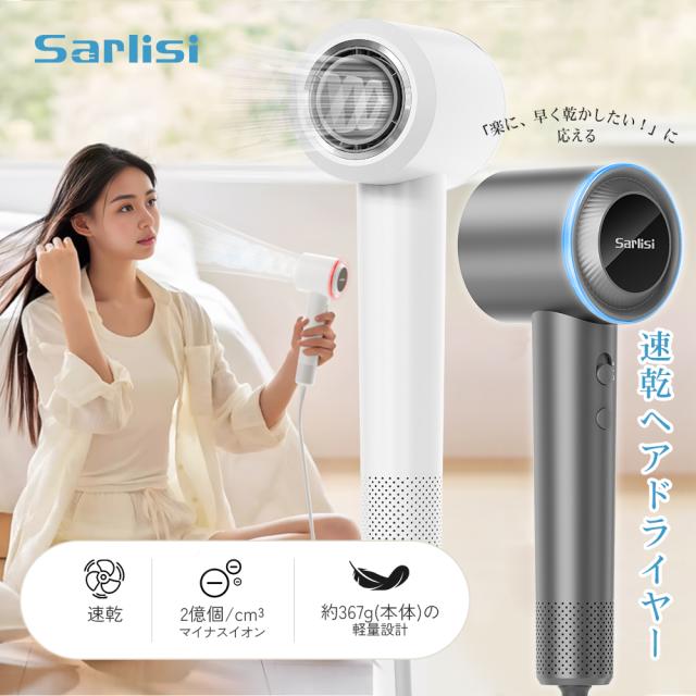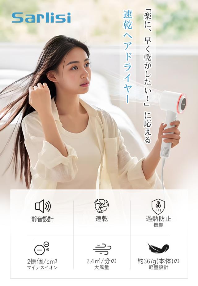 Sarlisiの大人気ヘアドライヤーは、2.4立方メートル/分の大風量で、ヘアドライヤーの時間を約50%短縮させ、速乾性にも優れています。疲れていた夜や、忙しい朝でも「楽に早く乾かす」を実現します。※自社製品比