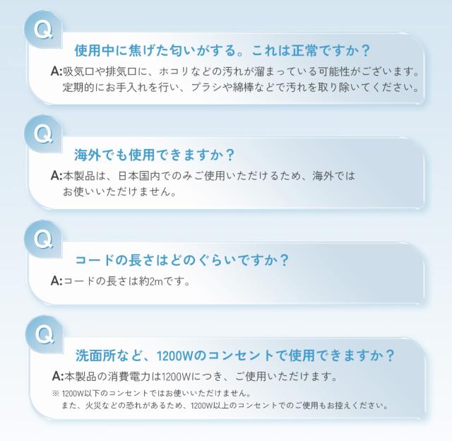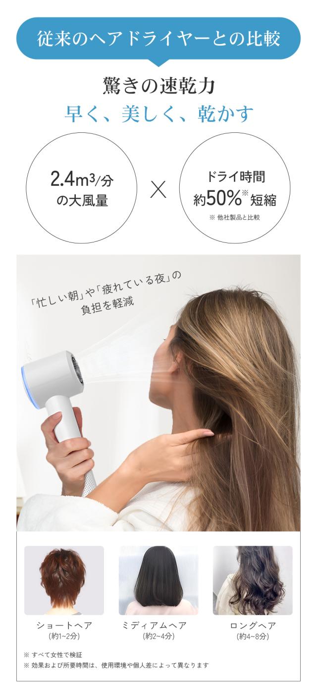 - 今まで使っていたドライヤーの半分の時間で乾きます。 使いやすくて気に入っています。
