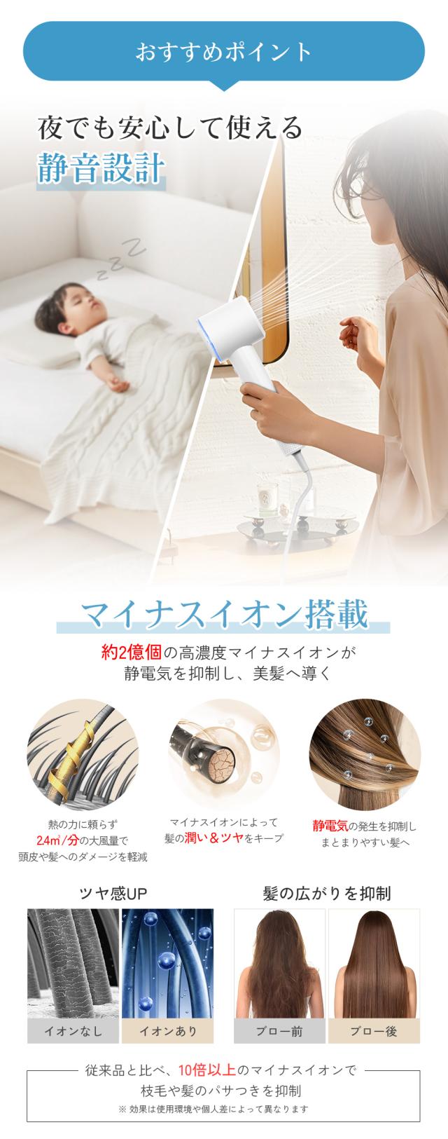 約2億個のマイナスイオンによって、マイナスイオンを大量に放出させることで、静電気を抑制し、まとまりやすい髪にしっとりした、柔らかい美髪を実現します。