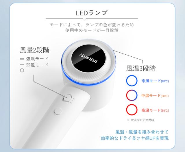 本製品は、風温が3段階、風量も2段階調節可能。風温と風量が簡単調整でき、髪や頭皮に優しく髪の潤い、ツヤ感アップ!LEDランプを搭載し、風温モードによって色が変わるのが一目瞭然です。