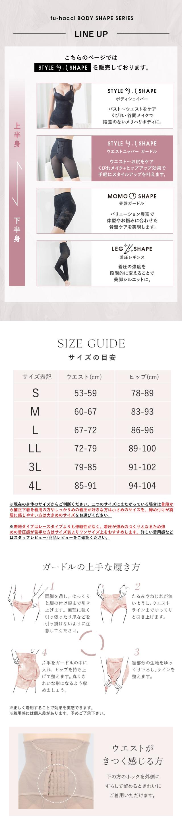 《対応サイズの目安》 【S】ウエスト:55-65cm、ヒップ:78-89cm 【M】ウエスト:63-73cm、ヒップ:83-94cm 【L】ウエスト:71-81cm、ヒップ:87-99cm 【LL】ウエスト:77-89cm、ヒップ:92-103cm 【3L】ウエスト:85-99cm、ヒップ:100-110cm 【4L】ウエスト:91-105cm、ヒップ:105-115cm ※対応サイズは目安となります。 |