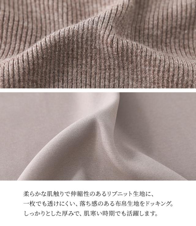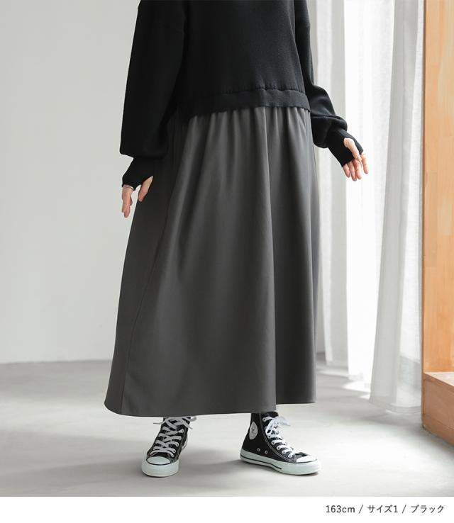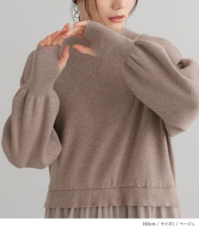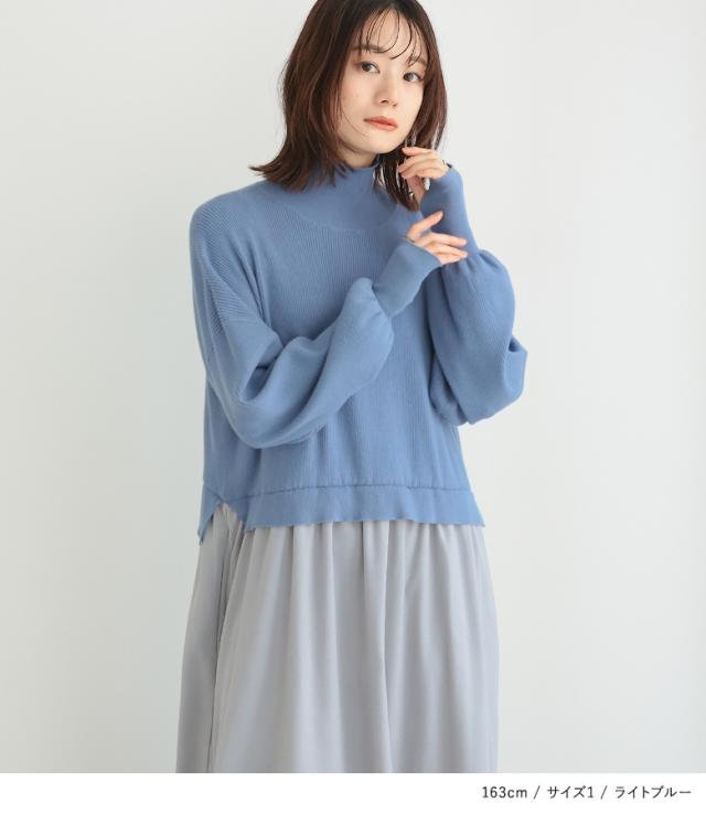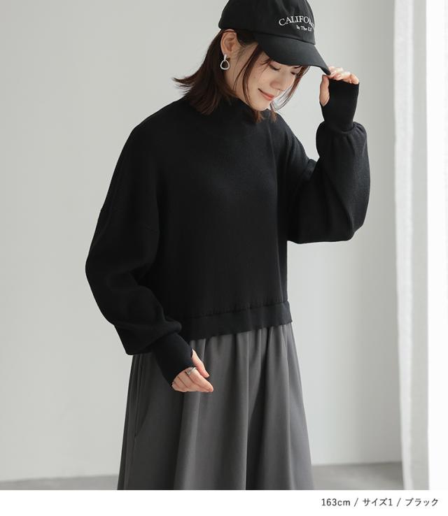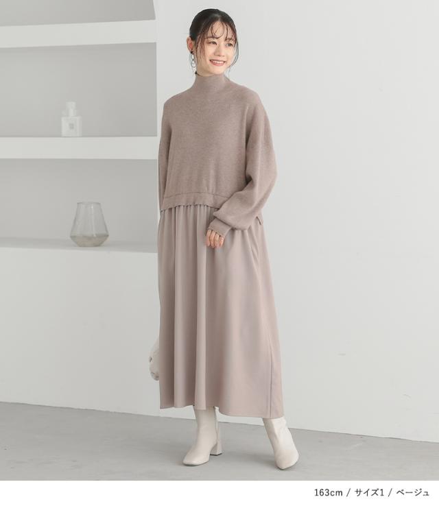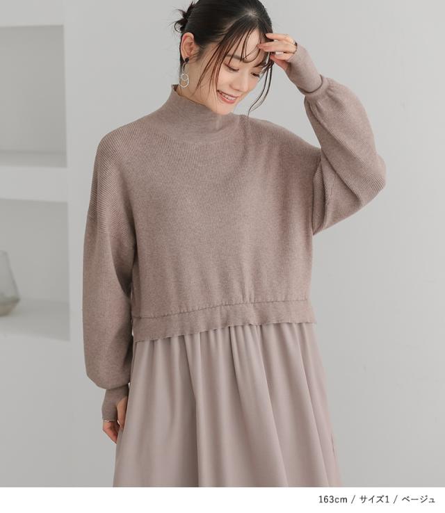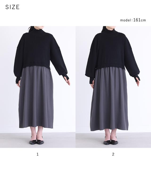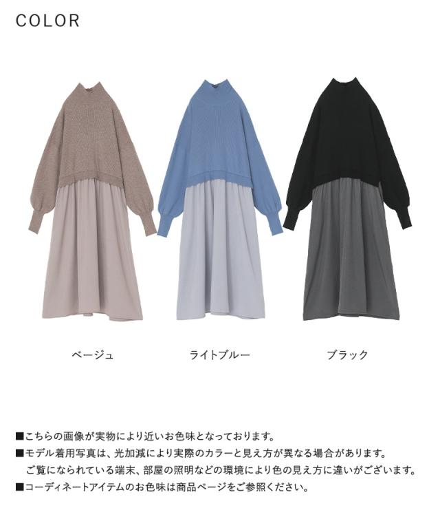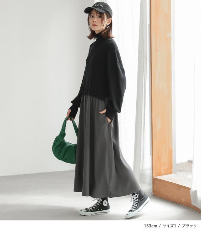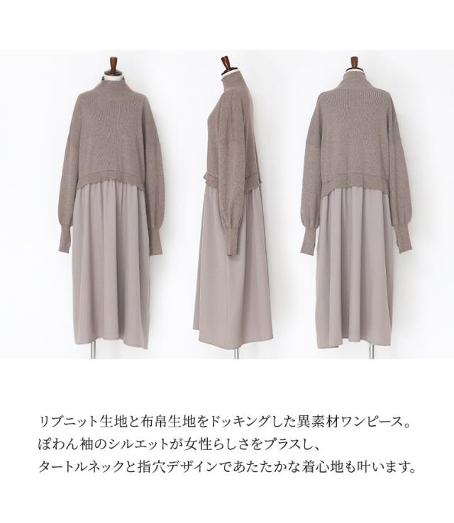 『タートルネックドッキングニットワンピース』【メール便不可】【40】[ワンピース 長袖 レディース ニットワンピース ロング丈 異素材 ぽわん袖 フレア ゆったり タートルネック]
