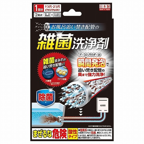 雑菌まみれの追い焚き配管に!ブーストパウダーの瞬間発泡で追い焚き配管の奥まで強力洗浄!1つ穴・2つ穴どちらでもOK。[発泡補助剤]+[ブーストパウダー]の2剤式。浴室小物の洗浄・除菌にも。1回分。