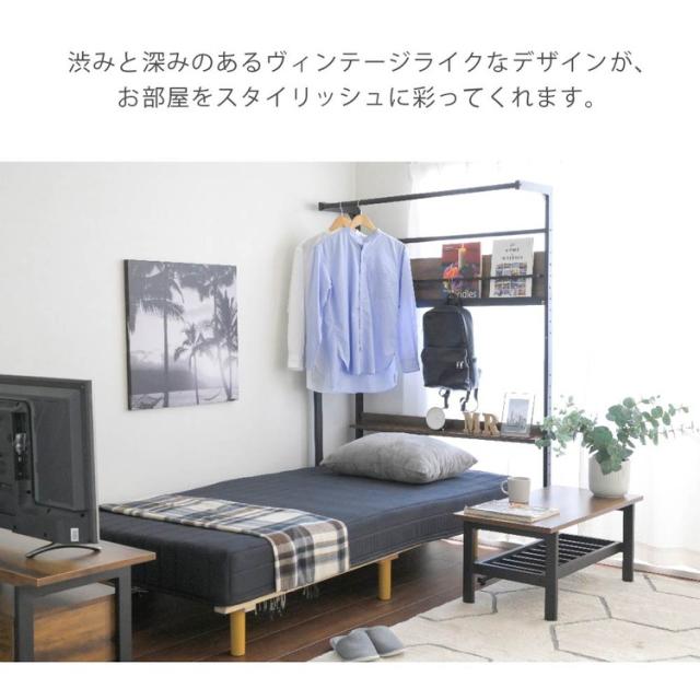 インダストリアルシリーズのベッドハンガーラック。普段よく使う洋服などはベッドの上にかけ、カバンや帽子、小物などはラックのサイドボールにちょい掛け収納。マガジンラックにはお気に入りの雑誌を並べたり、棚板にはスマホや時計、小物などをディスプレイすることもできます。