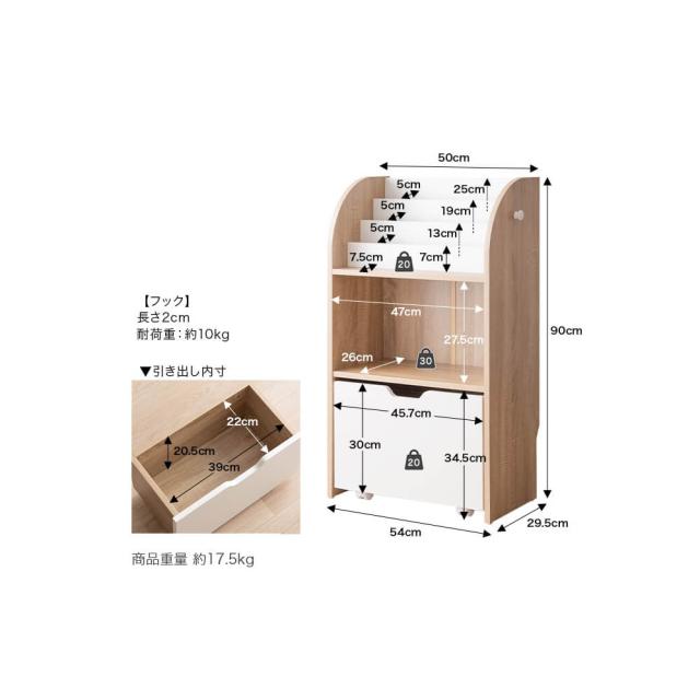 耐荷重:絵本棚:約20kg、オープン収納底板:約30kg、引き出し:約20kg、フック:約10kg