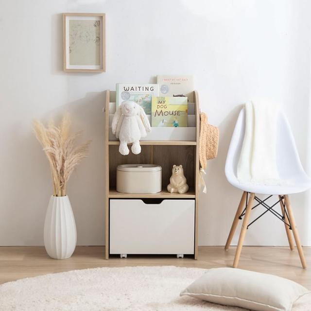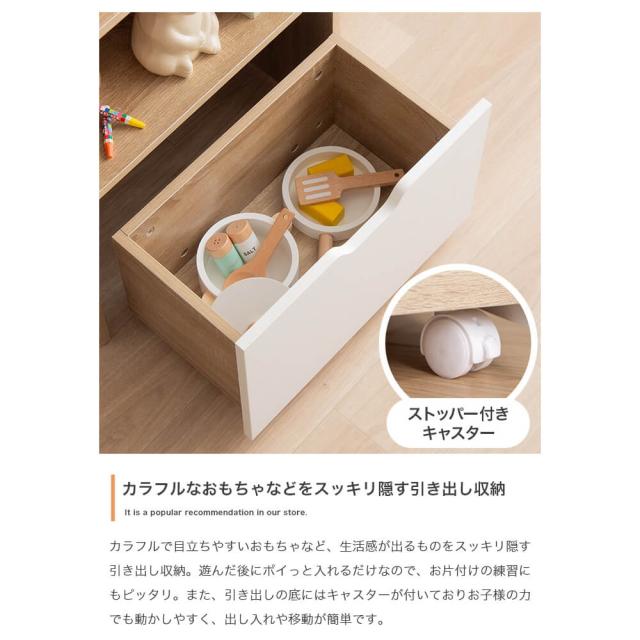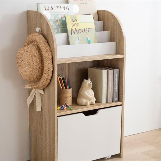 深さの異なる3つの絵本収納ポケット、オープン収納、キャスター付き大きな引き出し収納、そして大容量のラックが、さまざまなアイテムを整理できる多彩な収納スペースを提供します。
