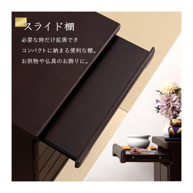 まら必要な時だけ拡張でき、コンパクトに納まるスライド棚は日々のお勤めやお供え物を置くのに便利。