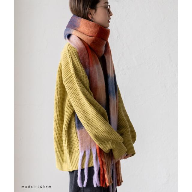 ふんわり柔らかな肌触りのボリュームのあるマフラー。