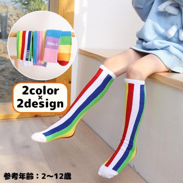 ハイソックス かかとなし 子供 キッズ 女の子 男の子 靴下 ロング ニーハイ 薄手 カラフル ボーダー ストライプ カジュアル