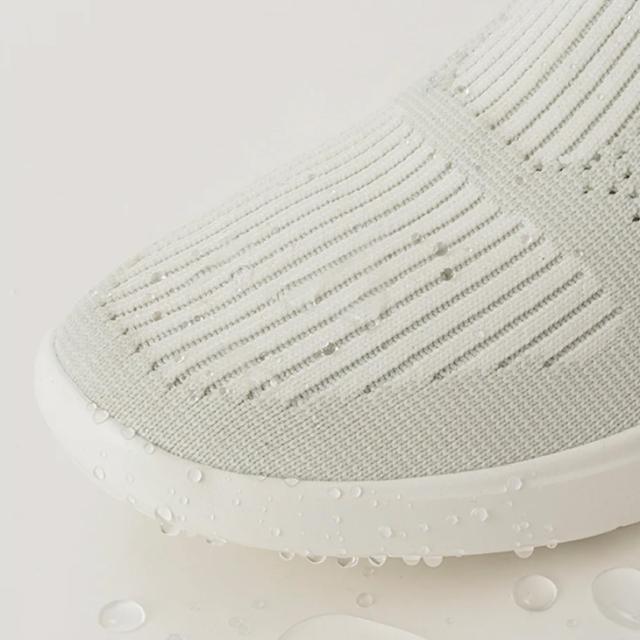 前足部を水落ちしやすいようなデザインにし、撥水ニットを採用することで、