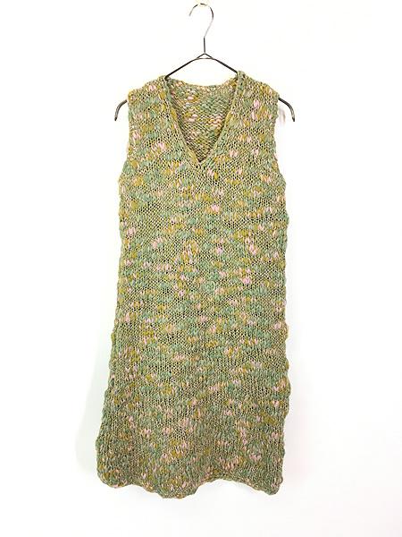 レディース 古着 70-80s グリーン×ピンク MIX ハンド ニット ノースリーブ ワンピース ひざ丈 M 古着