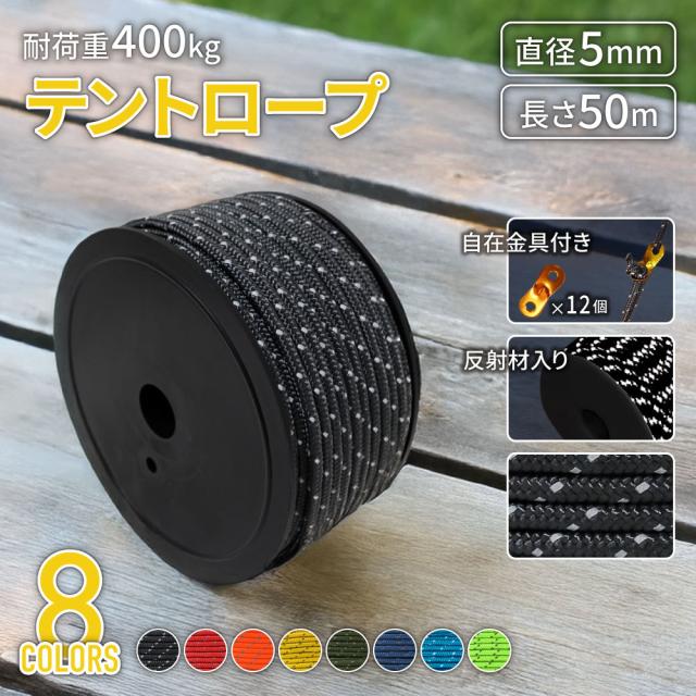 テントロープ 5mm 50m 選べる8色 テント ロープ キャンプ パラコード ガイロープ タープ ロープ 反射材 入り 太さ 5mm 長さ 50m 高耐久 引っ張り荷重 400 kg ガイドロープ アクセサリーコード 物干し ロープ ロール 芯数5 線軸数16 軽量