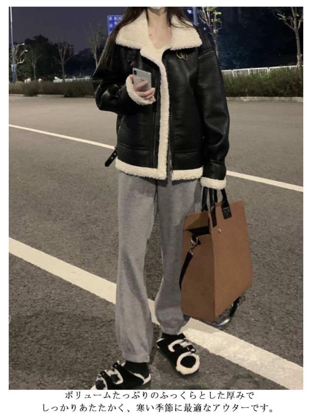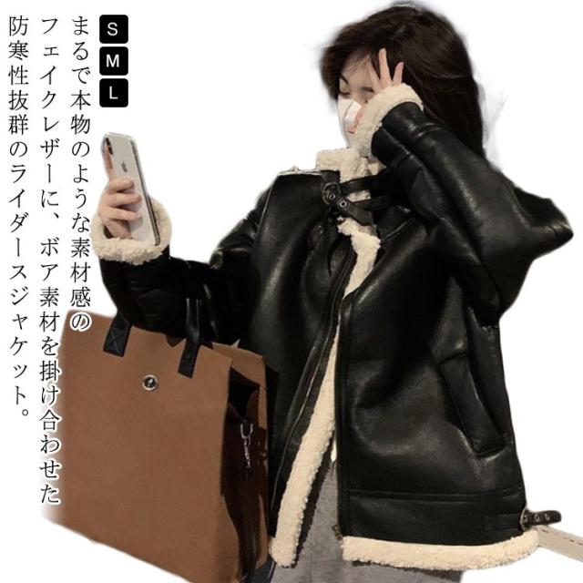 レディース ライダースジャケット あったか ボア ボアジャケット フェイクムートンジャケット ボアコート フェイクレザー 裏起毛 もこもこ 冬 フェイクムートンジャケット 秋 厚手 秋冬 アウター 裏ボア ゆったり オーバーサイズ 防寒 防風 かっこいい 大人 カジュアル 黒