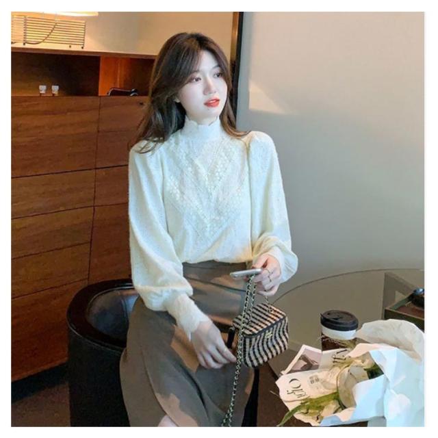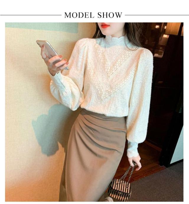プルオーバー ハイネック 長袖 ブラウス レディース 総レース カットソー レーストップス シャツ タートルネック ボリュームスリーブ 裏起毛 切り替え レースブラウス 送料無料 フェミニン インナー オフィス 通勤 あったか