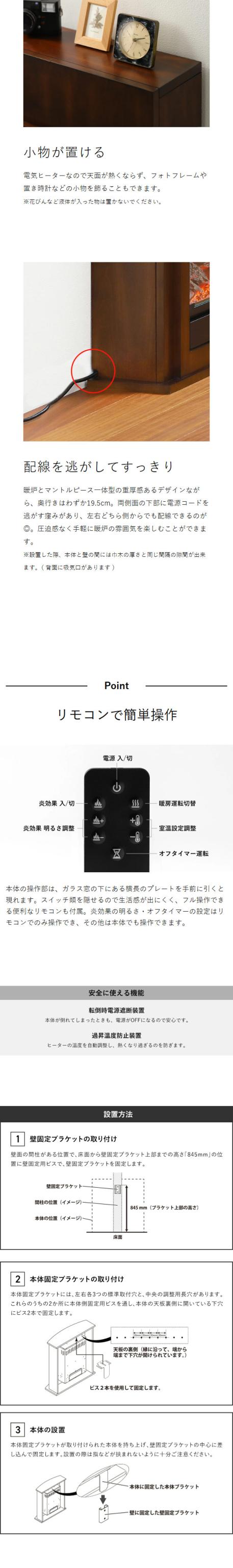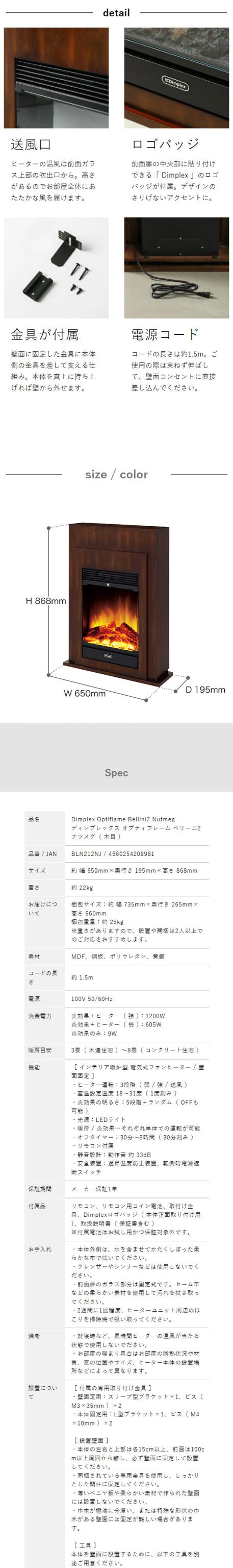 空間に溶け込む スリムで美しい電気暖炉 本物の炎のような揺らめきを楽しむ、暖炉型の電気ファンヒーター『 Dimplex ベリーニ2 ナツメグ 』。光の反射や屈折を利用してつくられた疑似炎は、眺めているだけで心癒される時間に。設定した室温になるように、前面のヒーターユニットから吹き出す温風で、周囲をしっかりと暖めます。オフタイマーや一年中活躍する送風機能を備えているほか便利なリモコン付き。スリムな奥行きで、備え付けのような佇まいも魅力。間柱に固定できる専用の取付け金具も付属しています。