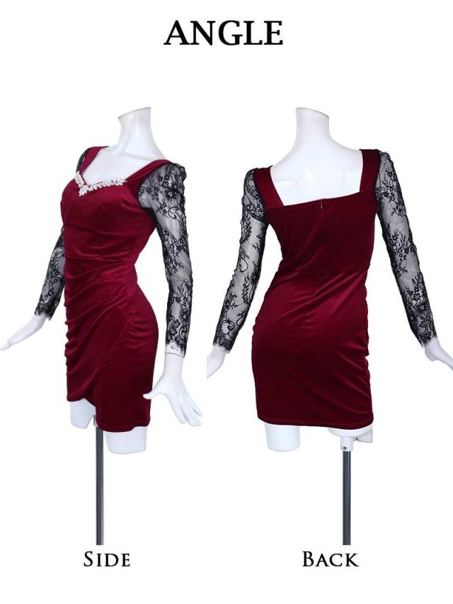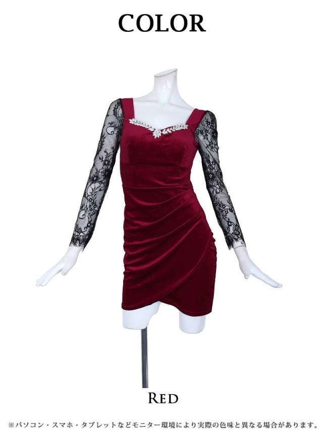 ミニドレス Ryuyu 袖付き ベロア 袖付きドレス レース袖付き 胸元ビジュー キャバ ドレス キャバドレス ミニドレス ミ