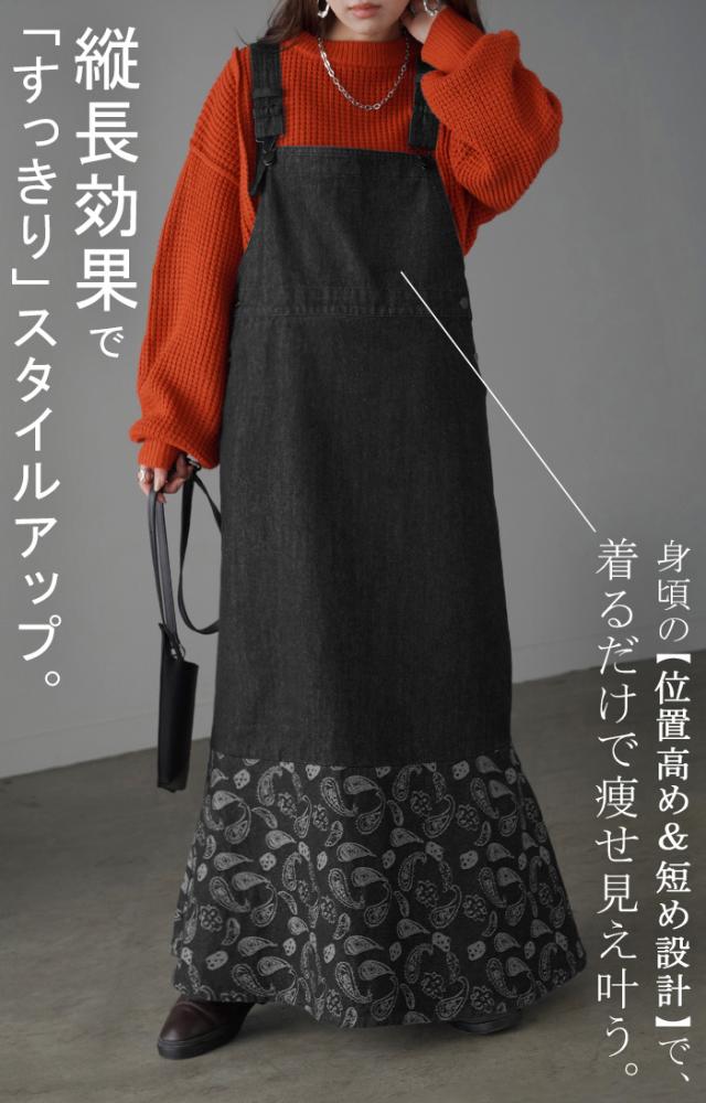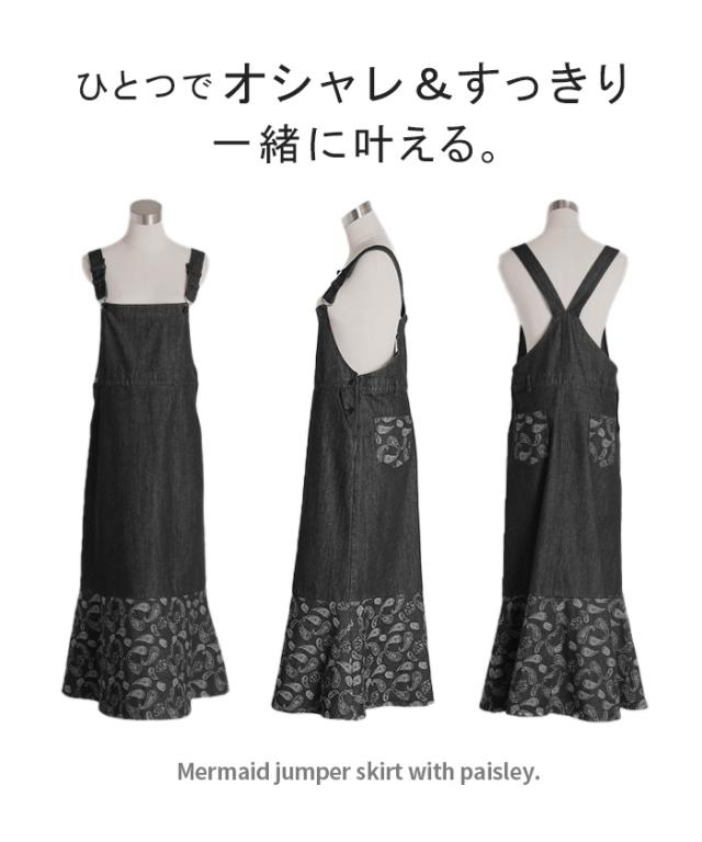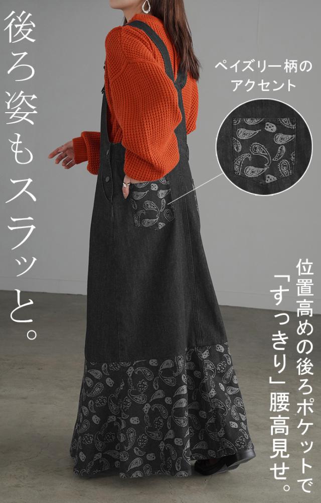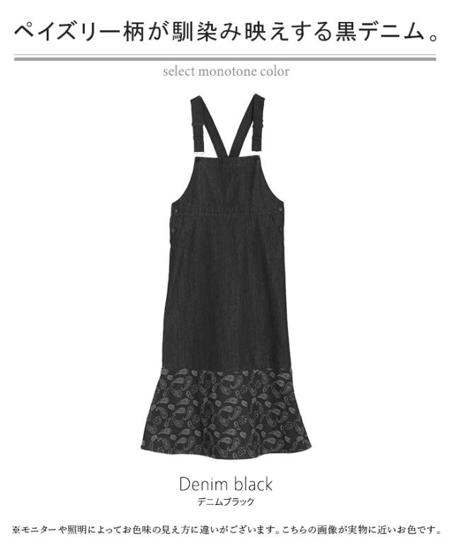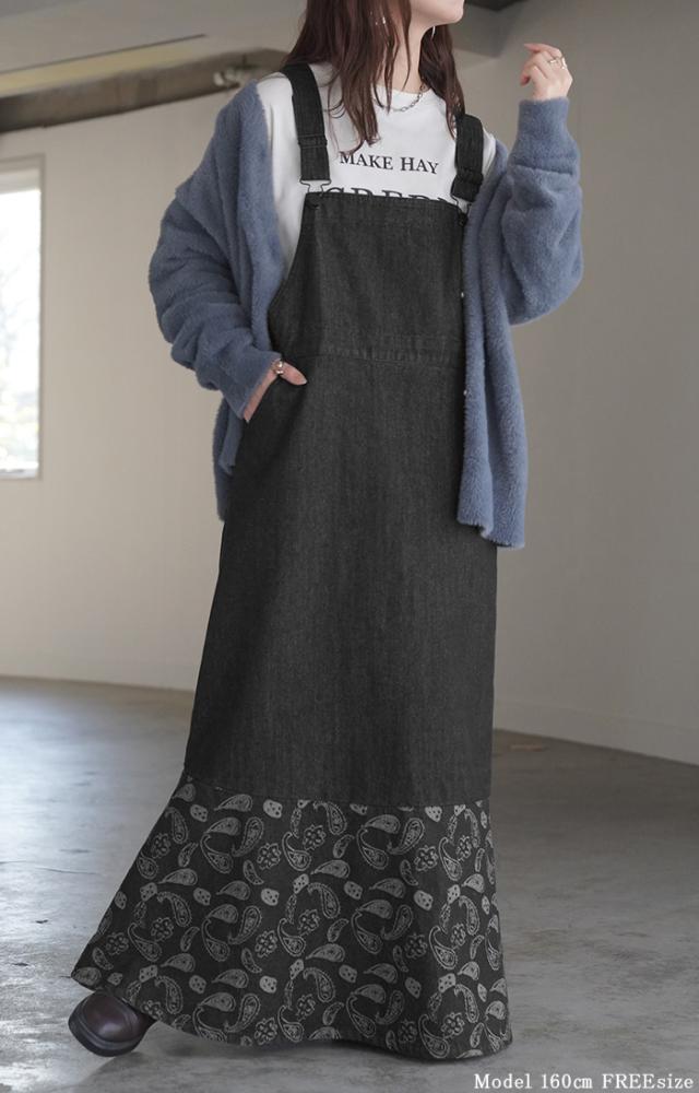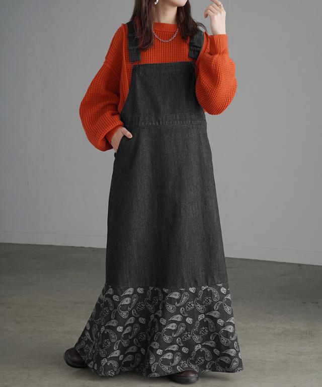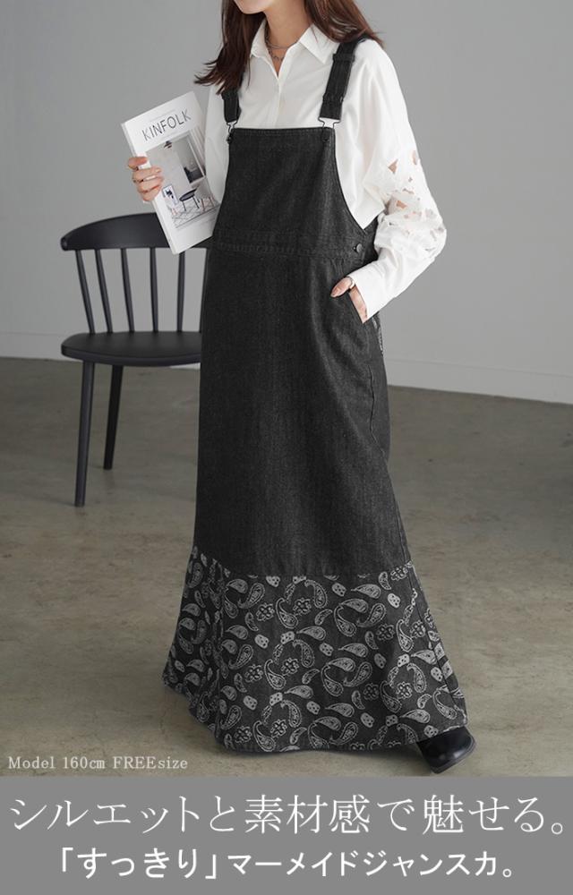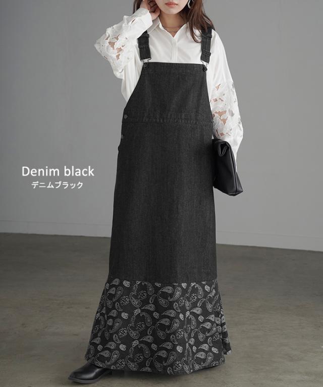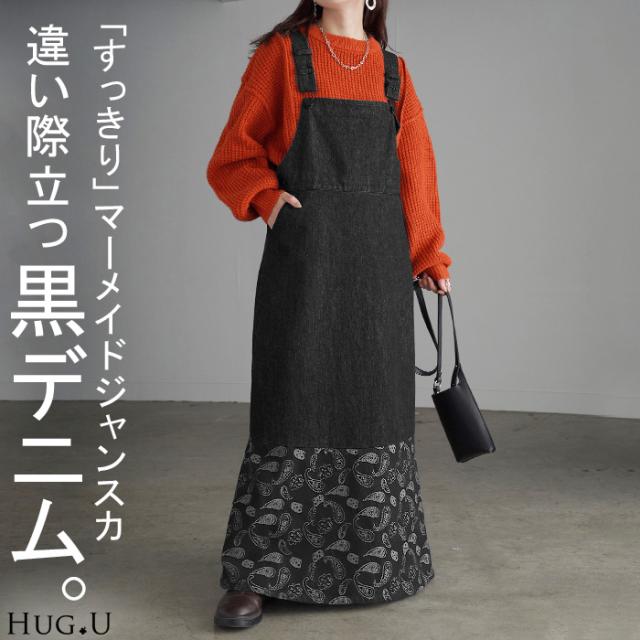 ワンピース デニム サロペット レディース スカート マーメイド ペイズリー 切り替え ジャンパースカート ロング 調節可能 ノースリーブ ロングワンピース オーバーオール レイヤード 重ね着 体型カバー 大きいサイズ 黒 ブラック 秋 冬 HUG.U 秋新作