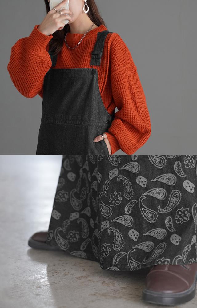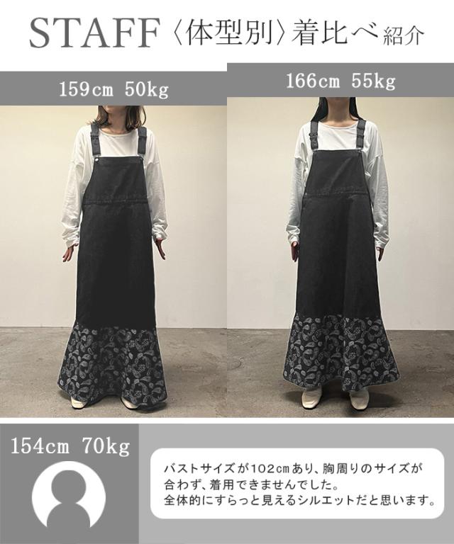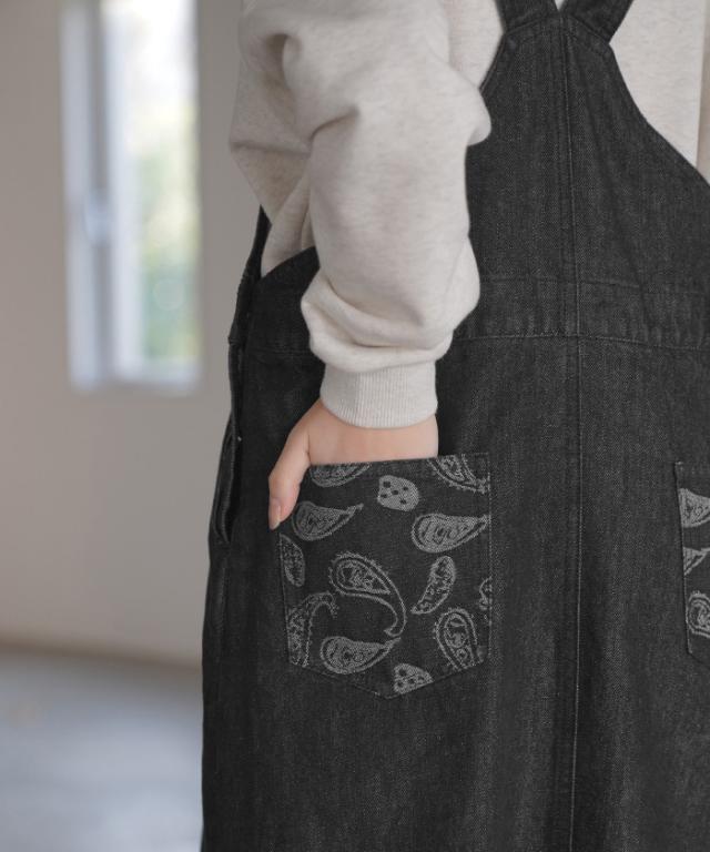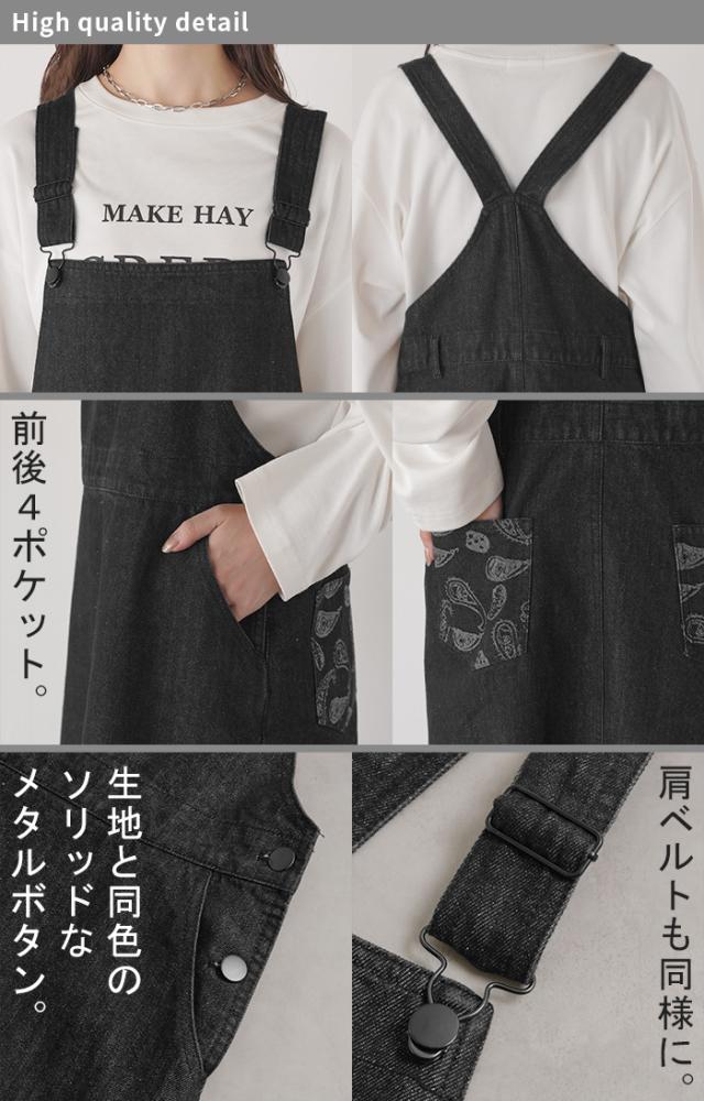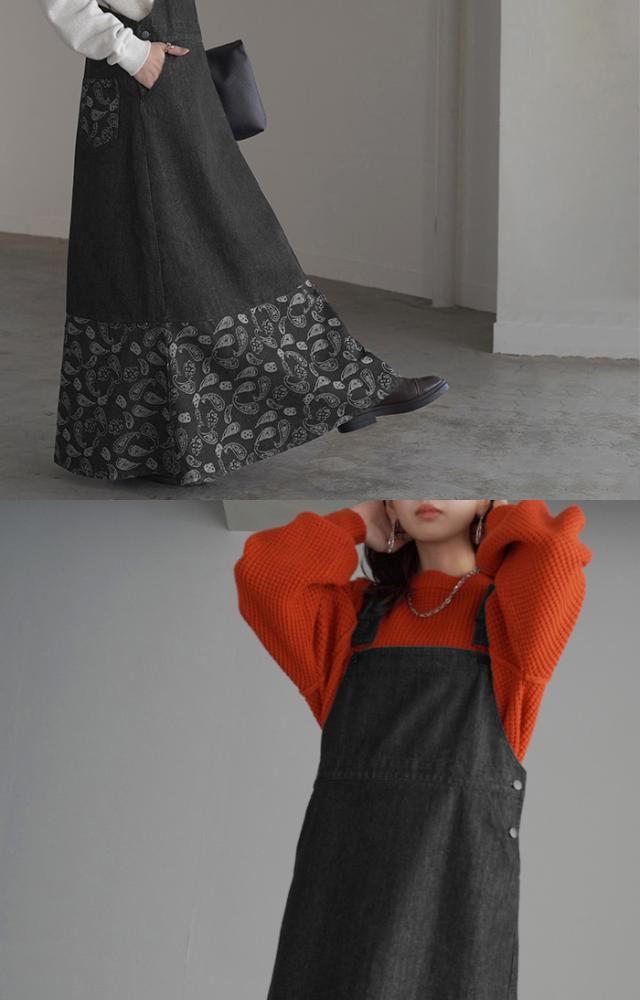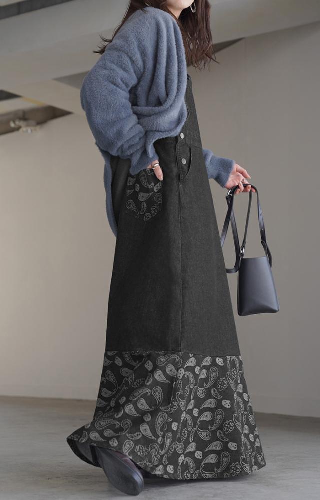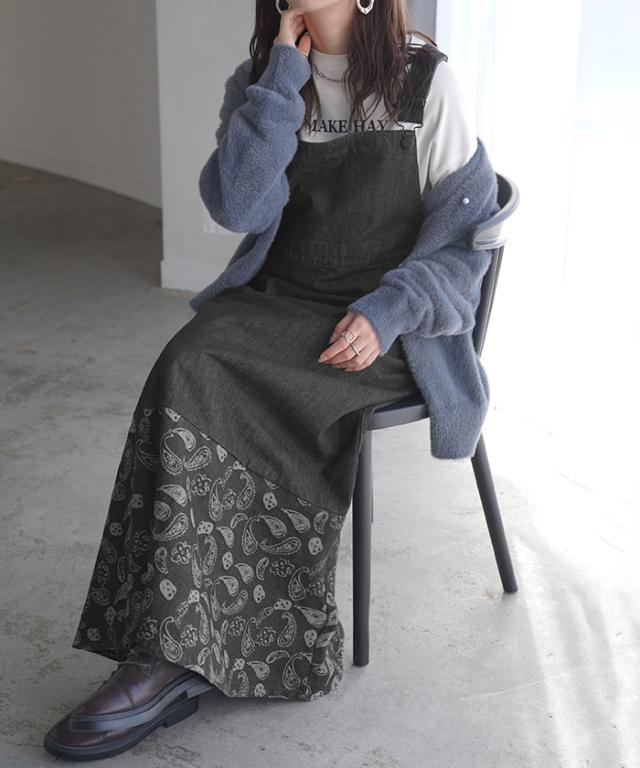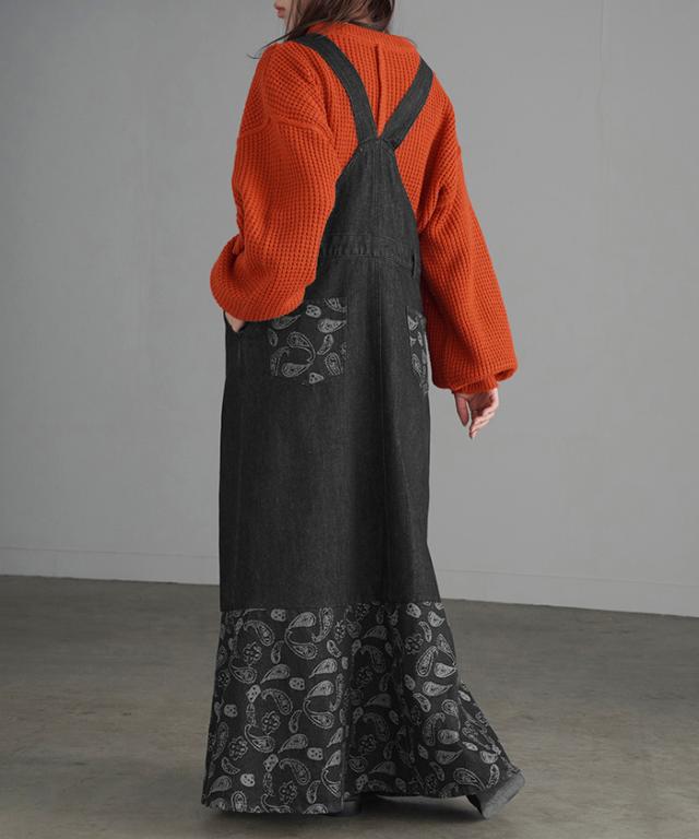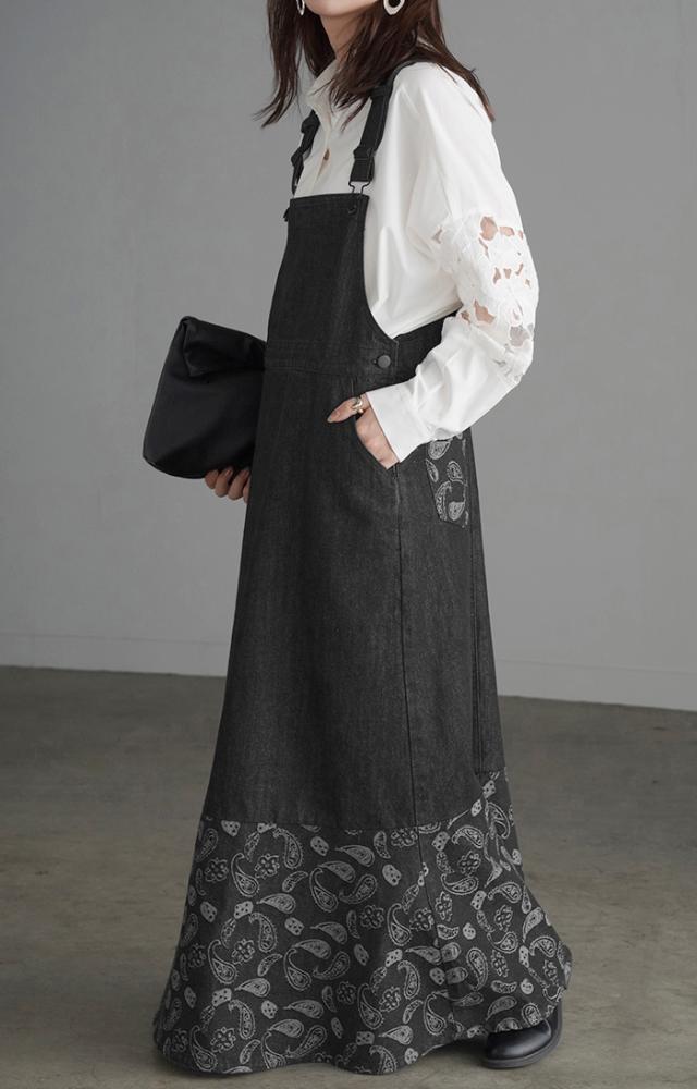 ワンピース デニム サロペット レディース スカート マーメイド ペイズリー 切り替え ジャンパースカート ロング 調節可能 ノースリーブ ロングワンピース オーバーオール レイヤード 重ね着 体型カバー 大きいサイズ 黒 ブラック 秋 冬 HUG.U 秋新作