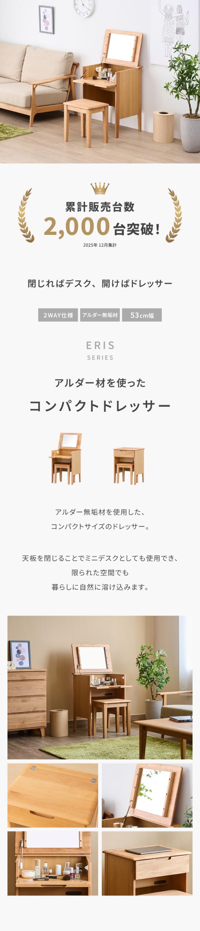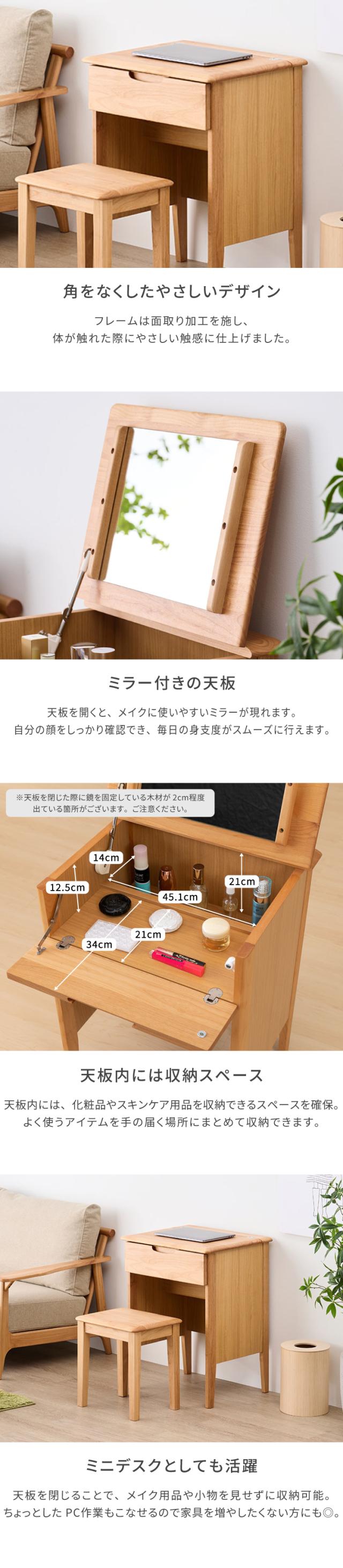 ドレッサー テーブル コンパクト 完成品 椅子 新生活 化粧台 鏡台 メイク台 一面鏡 テーブル デスク 机 鏡 ミラー コンセント 木製 天然木 北欧 シンプル おしゃれ スツール 女子 一人暮らし ERIS 品質保証 ISSEIKI