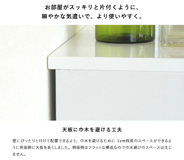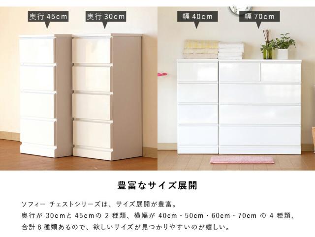 清潔感のあるホワイトカラーが美しくシンプルなデザインの『ソフィー』。どこに置いても違和感がなく脱衣洗面所やリビング、寝室など家じゅうのあらゆるところで活躍します。こちらの商品は幅50cm奥行30cmタイプになります。使いやすいサイズで家中どこに置いても重宝します。全体は美しいホワイトカラーを水や汚れに強いウレタン塗装を艶やかな『エナメル鏡面仕上げ』にし、高級感のある仕上がりに。引き出しの前板の下部が斜めにカットされたデザインで、そこに指を掛けて引き出します。全ての引き出しにはフルスライドレールを採用。奥まで引き出しても落下の心配がなく、開閉も軽やかでとても便利です。壁にぴったりと付けて配置できるように天板の背面側を長くしました。それによって、壁とのスペースがが1cm程できるので巾木を避けることができます。限られたスペースを有効に利用できるよう設計された『ソフィー』シリーズで揃えれば作り付けの家具のような統一感が生まれます。背面も美しく仕上げてあるのでお部屋のパーテーションのようにも使える使いやすいシリーズです。