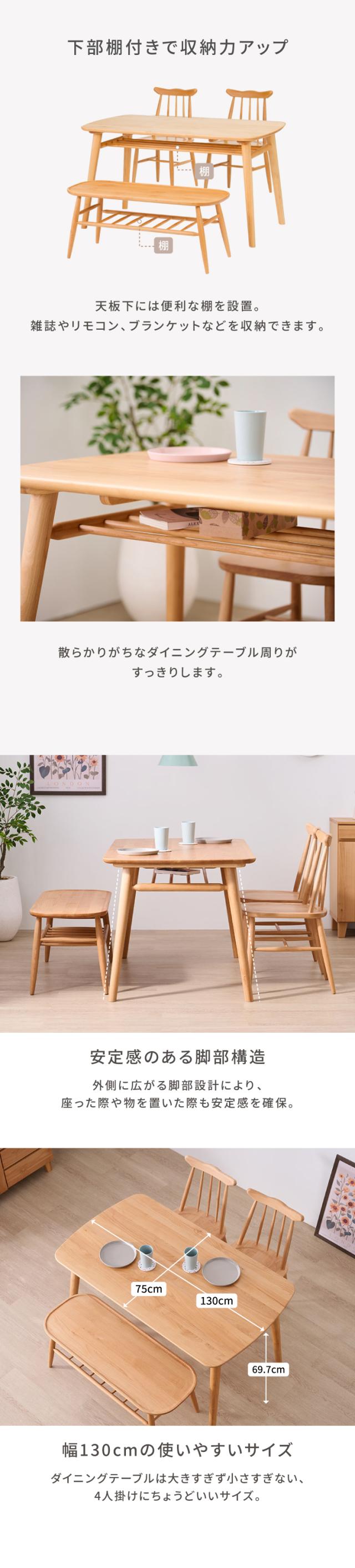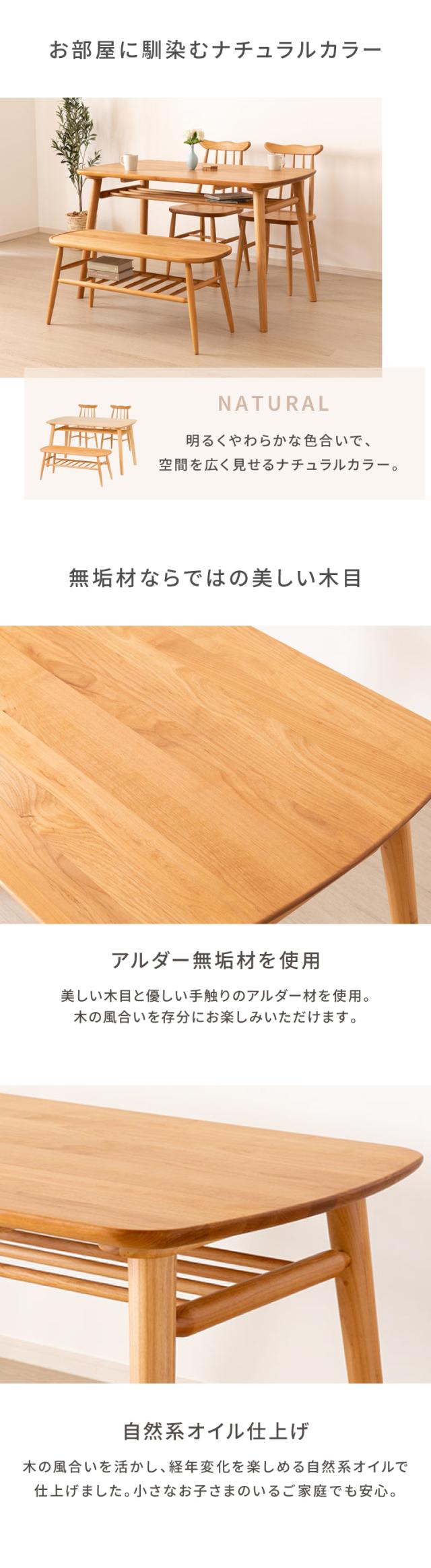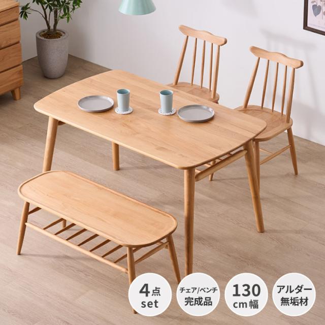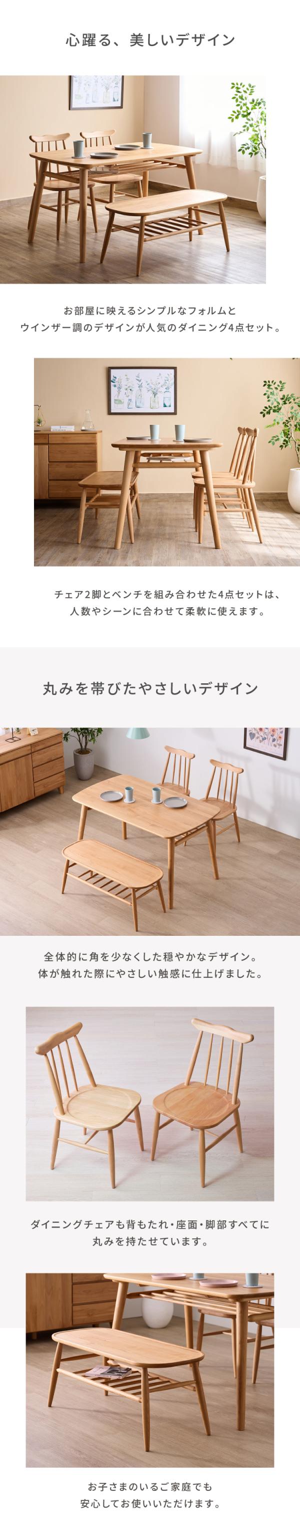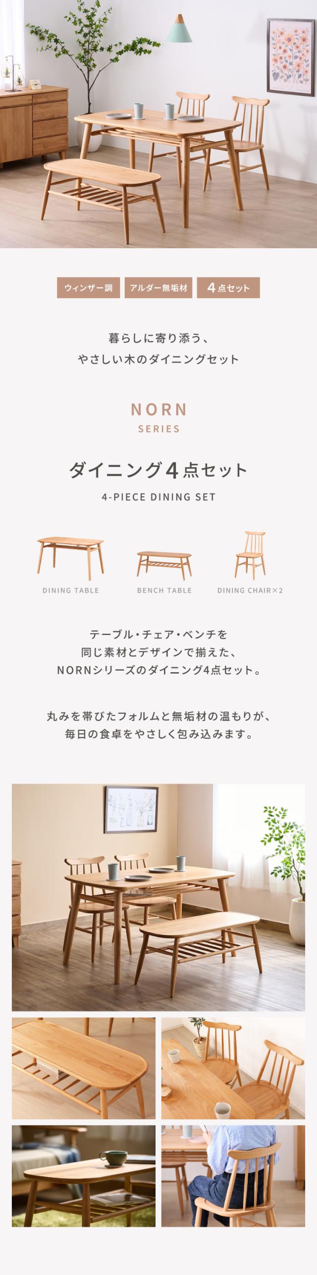 ダイニングテーブルセット ダイニングセット テーブルセット 4点 4人掛け テーブル チェア ベンチ 背もたれ無し 棚 ラック 木製 天然木 ウィンザー調 レトロ 北欧 カフェ 店舗 什器 品質保証 NORN ISSEIKI