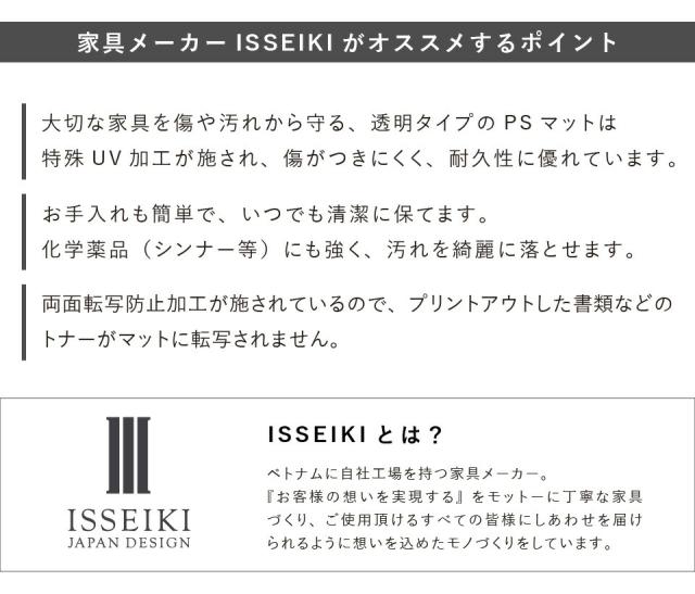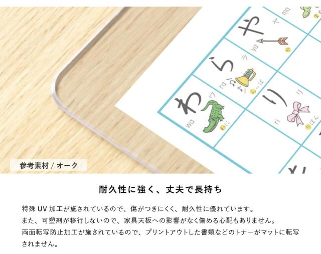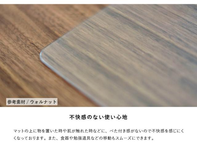 透明度が高く、家具本来の見栄えに近い状態での使用が可能です。ベタつきが少ないので、食器などスムーズな移動が可能です。コーティングが施されており、傷に強く、耐久性に優れています。また、コーティングにより可塑剤が移動しないため、商品天板への影響も心配ありません。化学薬品に対しても強く、綺麗に汚れを落とすことができます。