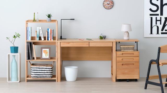 シンプルなデザインが人気の『L-DESK』シリーズのデスク3点セットです。良質なアルダー材の温かい木目、主張しすぎない個性がどんなテイストのお部屋にもしっくり馴染みます。仕上げには自然系オイルを使用したのでお子様にも安心してお使いいただけます。木材の風合いが充分に堪能でき、使い続けるほどに味わい深くなっていきます。このワゴン最大の魅力は天板に設けた昇降機能。9段階に高さ調節が可能で、L-DESKの幅105cm学習デスクと天板高を揃えられます。デスクスペースの拡張に役立ちます。木製のペントレーや最上段の鍵、A4が収納可能な収納力のある引き出しなど、勉強だけでなく普段の収納にも使いやすい仕様をたっぷり詰め込みました。